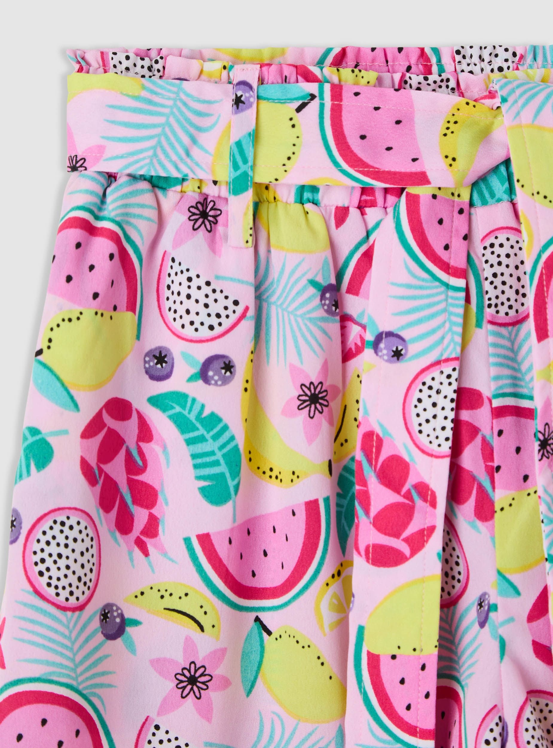 Шорты для девочек модели бермуда с фруктовым принтом, идеально подходят для летних образов и активного отдыха на свежем воздухе. Пояс на резинке с эластичной сборкой и шлевками подчеркивает посадку и дополняется завязывающимся ремнем. Свободный крой и широкие штанины обеспечивают свободу движений, отлично сочетаются с футболкой и сандалиями или с топом и кроссовками для школы и отдыха.Детали