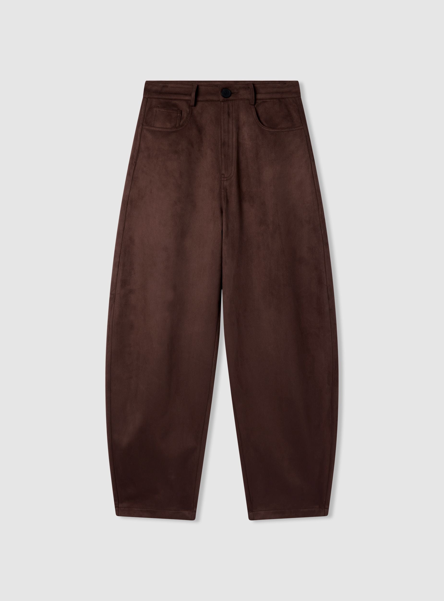 Женские длинные брюки из материала с эффектом замши, модель balloon. Передняя застежка на пуговицу и молнию, передние карманы в стиле джинсов с небольшим кармашком. Свободный крой по ноге делает их удобными для повседневного ношения и идеально подходят с заправленной футболкой или мягкой рубашкой для повседневного или городского образа. Идеальны с кроссовками или ботильонами на день.Детали