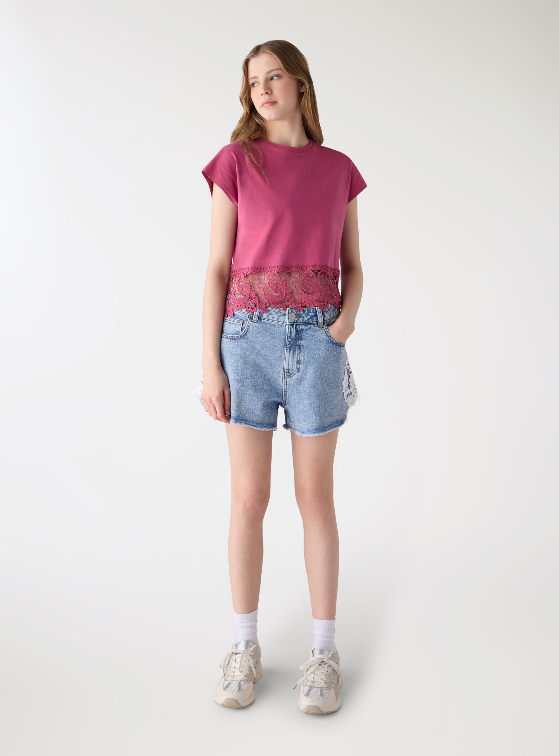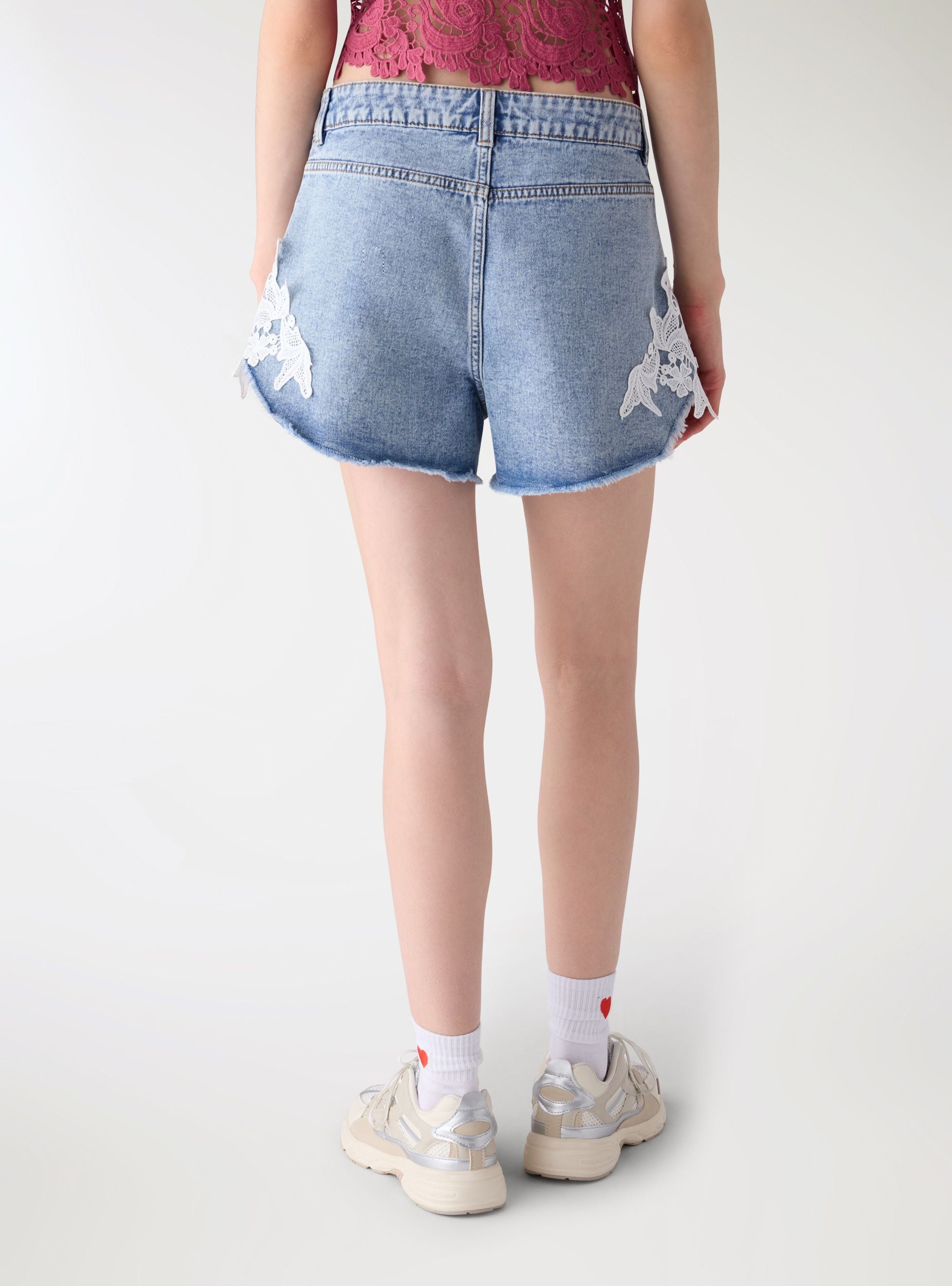 Женские шорты с эффектом джинсы, с обычной посадкой на талии и шлевками для ремня, идеально подходят для повседневных летних образов. Застегиваются на пуговицу и молнию, модель с пятью карманами для максимального удобства. Дизайн украшен боковыми вставками из цветочного макраме и бахромой на подоле, отлично сочетается с топами, легкими рубашками, кроссовками или сандалиями.Детали