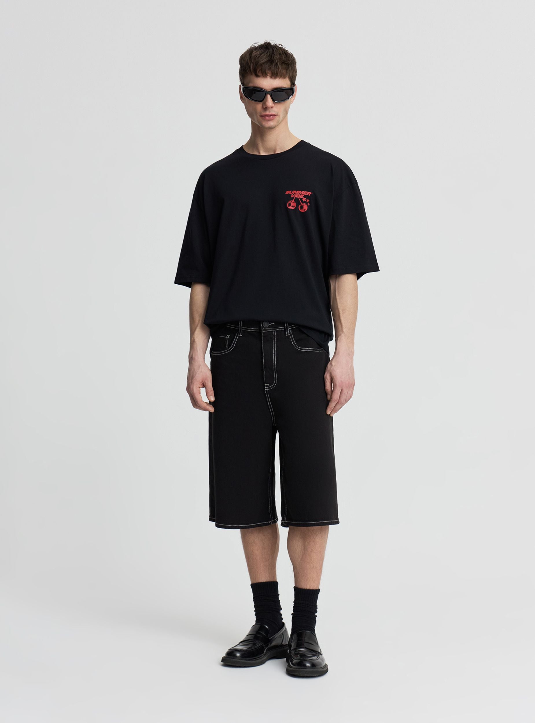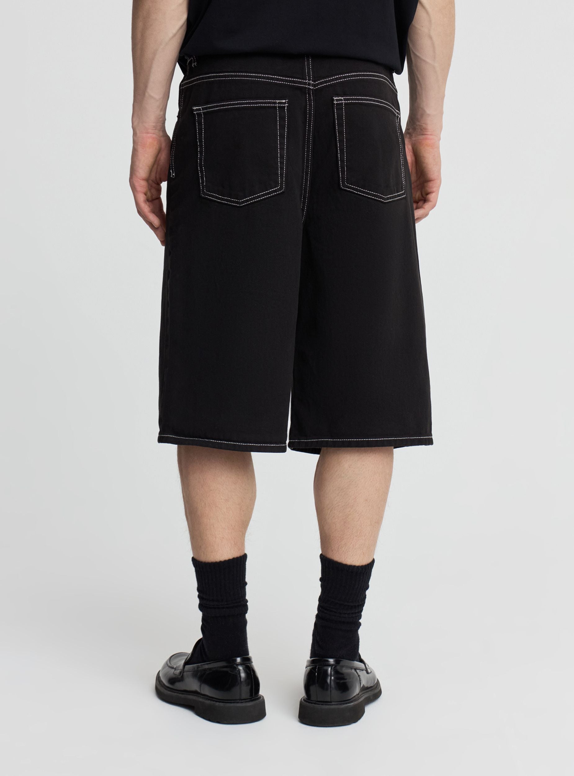 Мужские однотонные джинсовые шорты свободного кроя, идеально подходят для городских образов и выходных. Модель с шлевками на поясе, застежкой на пуговицу и молнию, а также удобными карманами в стиле 5 карманов, с накладными задними карманами. Контрастные швы подчеркивают дизайн и легко сочетаются с толстовками и футболками.Детали