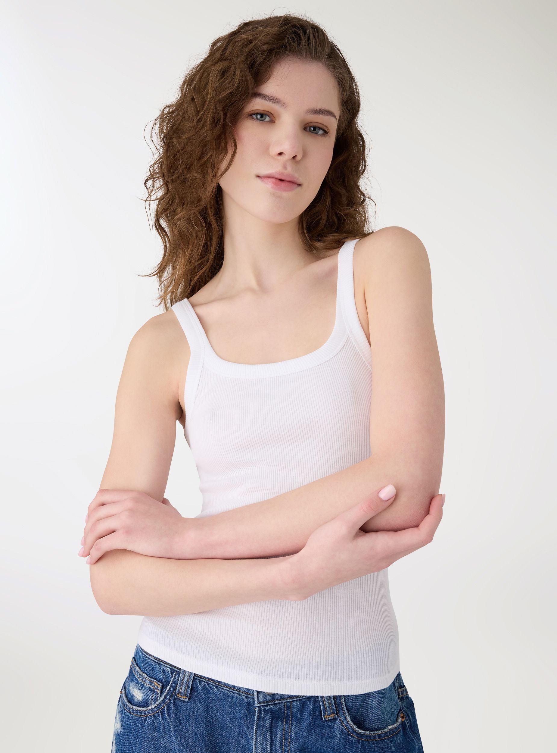 Женская однотонная майка с тонкими бретелями и круглым вырезом. Ребристая ткань обеспечивает комфорт и облегающую посадку, идеально подходит под пиджаки или рубашки для многослойных образов, либо носится отдельно с джинсами или шортами в свободное время. Минималистичный и женственный крой, стандартная длина и аккуратная отделка по краям для чистого и универсального эффекта.Детали
