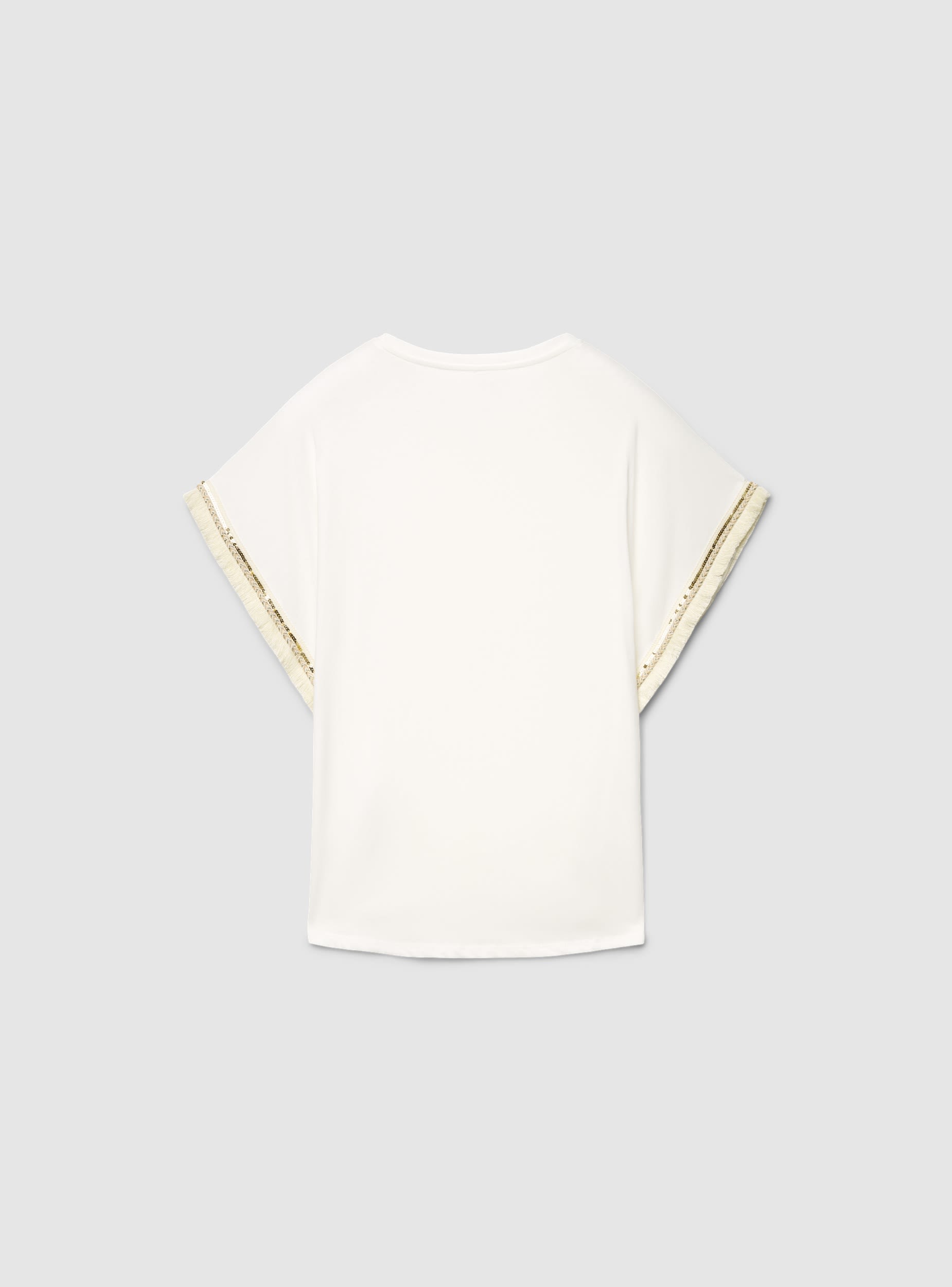 Женская однотонная футболка свободного кроя, созданная для повседневного и городского стиля. Круглый вырез и широкие короткие рукава в стиле кимоно обеспечивают комфорт и свободу движений. Манжеты рукавов с этнической вставкой и бахромой придают характер и подчеркивают образ с джинсами, свободными брюками или юбками, идеально подходит для повседневной носки и отдыха.Детали