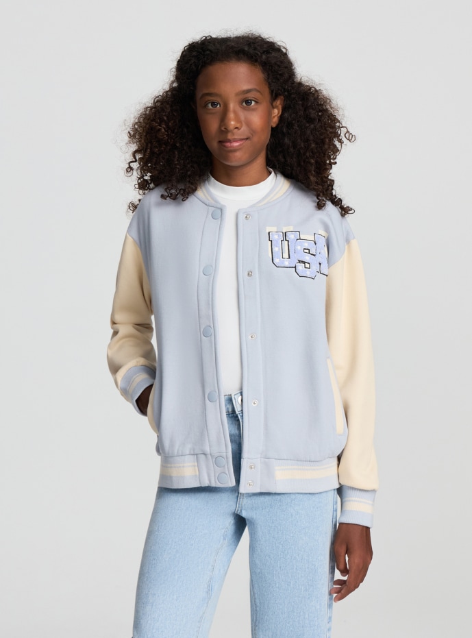 Heavy fleece bomber jacket for girls with college prints on the front and back. Ideal for a casual and sporty look, this garment features a snap button closure and a banded collar. The long sleeves and printed design make the bomber perfect for completing modern and dynamic outfits. Excellent for pairing with jeans or sporty trousers, it guarantees comfort and style on every occasion.