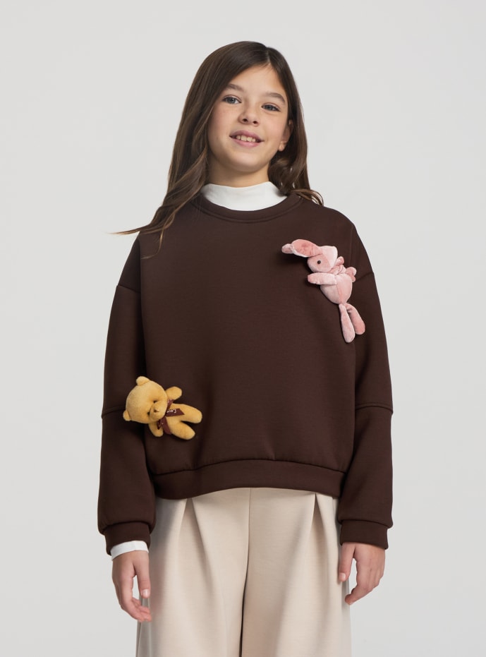Girls' sweatshirt in a solid colour with a crew neck and long sleeves, featuring plush appliqués in the shape of a bunny and a teddy bear on the front. Zip-free and hood-free design, with elasticated cuffs and hem for a comfortable fit. Ideal for leisure time and school, pairs well with jeans or joggers for fun, casual looks. Lightweight fabric.