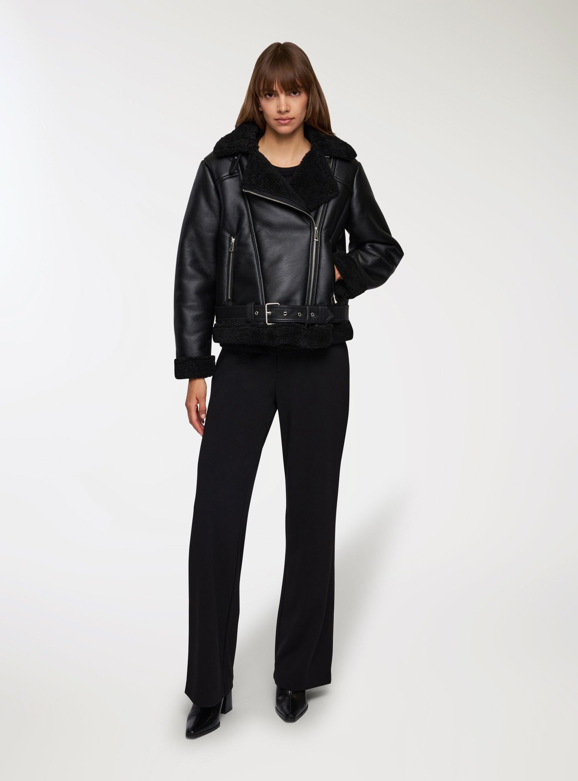 Dámska bunda, vyrobená z umelého ovčieho rúna, ideálna pre mestský a moderný vzhľad. Perfektná na chladné dni, táto bunda sa vyznačuje bikerským štýlom s detailmi na zips a nastaviteľným opaskom. Regulárny strih ju robí pohodlnou a všestrannou, vhodnou na kombinovanie s džínsami alebo voľnými nohavicami. Kúsok, ktorý spája praktickosť a štýl pre trendy outfit.Detaily