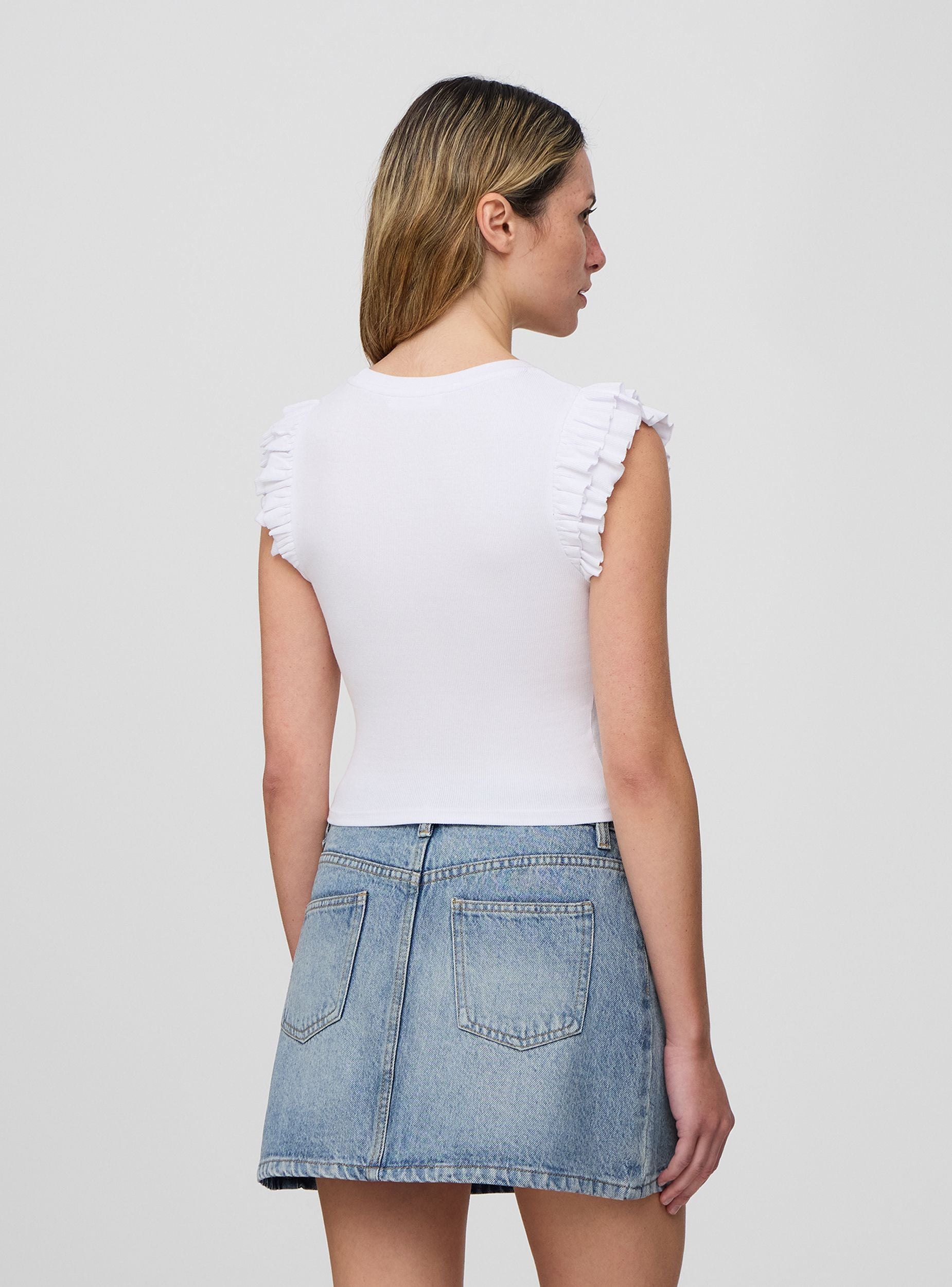 Dámske tričko v jednofarbném prevedení s crop strihom. Rukávy sú zdobené elegantnými volánmi, ktoré dodávajú kusu ženský a jemný nádych. Perfektné na neformálne alebo sofistikovanejšie kombinácie, ideálne na letnú sezónu vďaka sviežemu a ľahkému dizajnu.Detaily