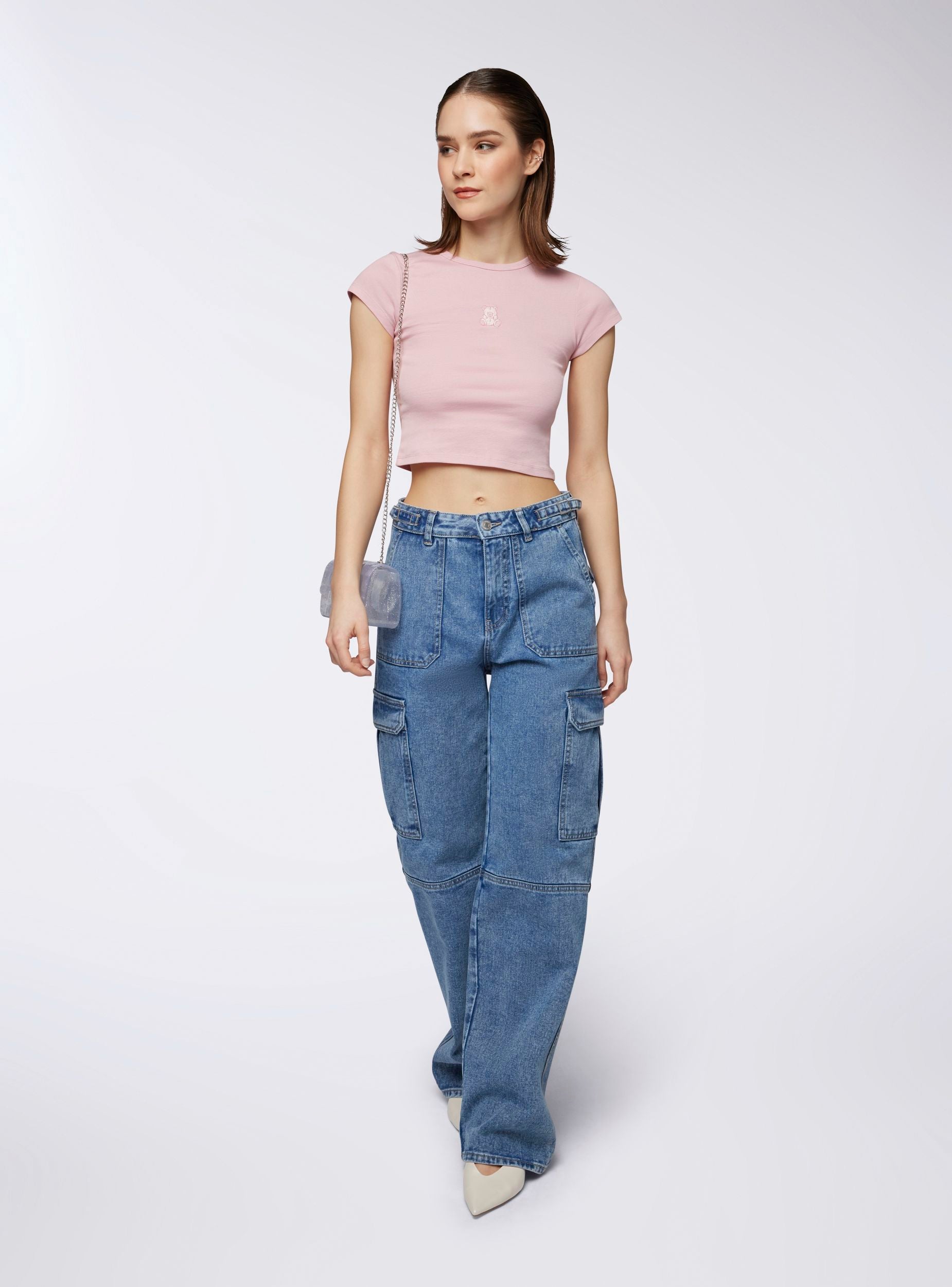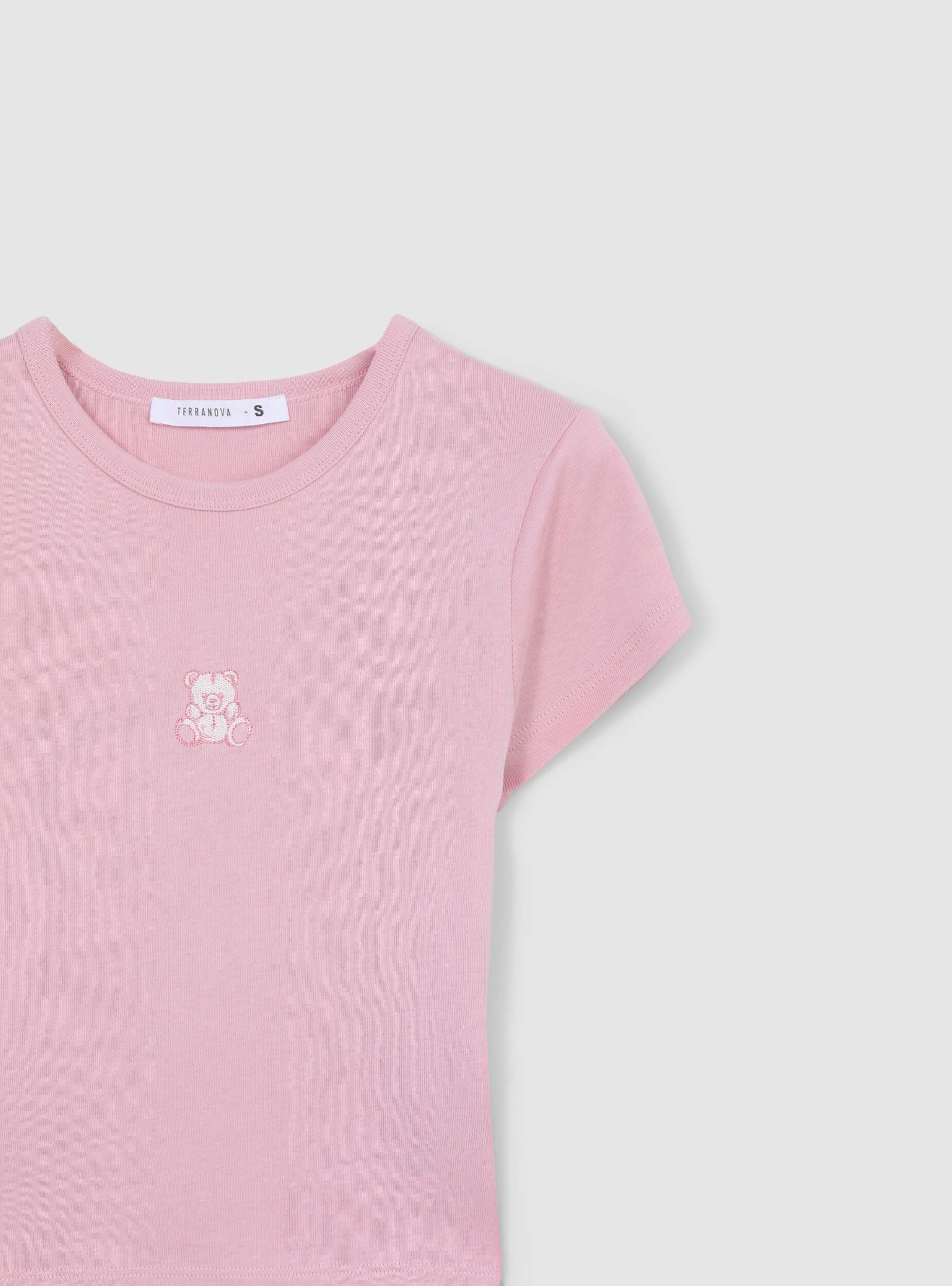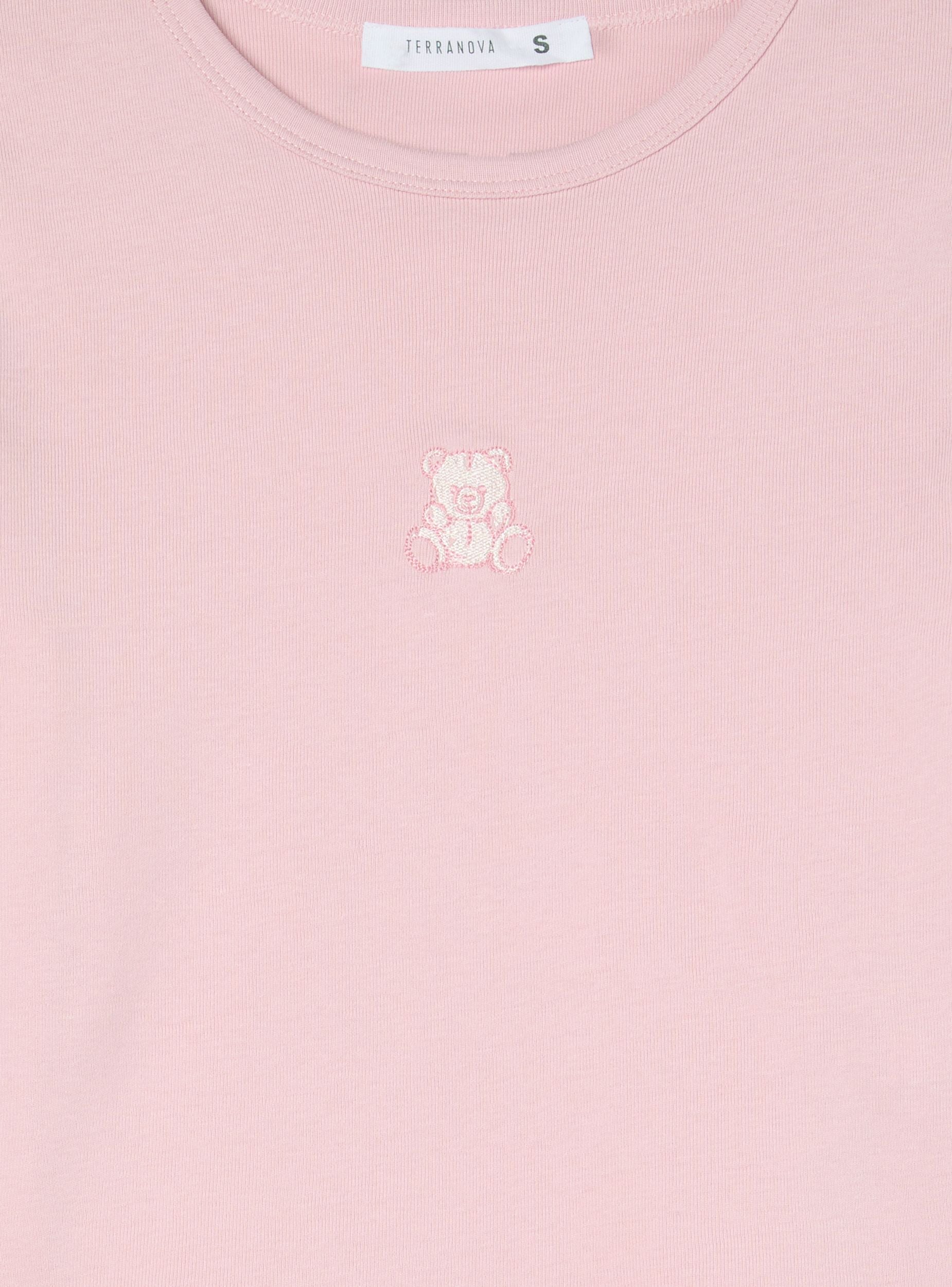 Dámske tričko s jednoduchým dizajnom, ideálne pre ležérny a romantický vzhľad. Jednofarebný model s krátkymi rukávmi a okrúhlym výstrihom sa vyznačuje rafinovanou výšivkou s medvedíkom na prednej strane, ktorá pridáva sladký a originálny dotyk. Ideálne pre každodenné outfity, ľahko sa kombinuje s vysokými džínsami alebo ľahkými sukňami pre ženský nádych. Perfektné na voľný čas alebo pre uvoľnený, ale upravený vzhľad.Detaily