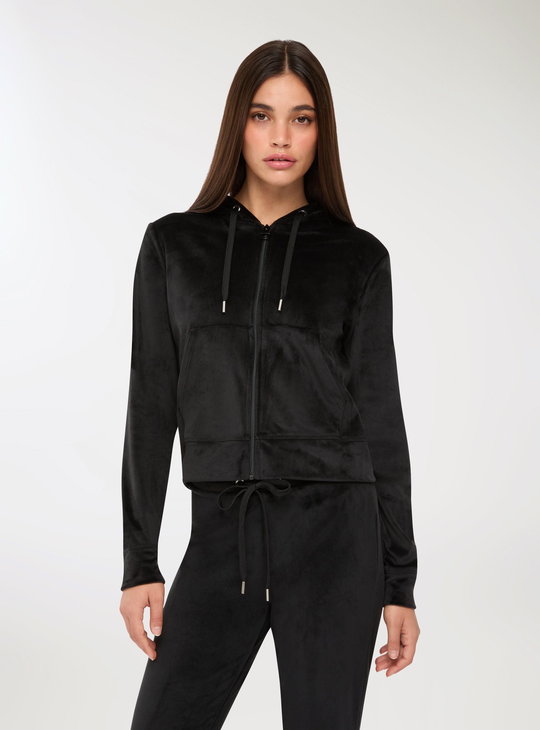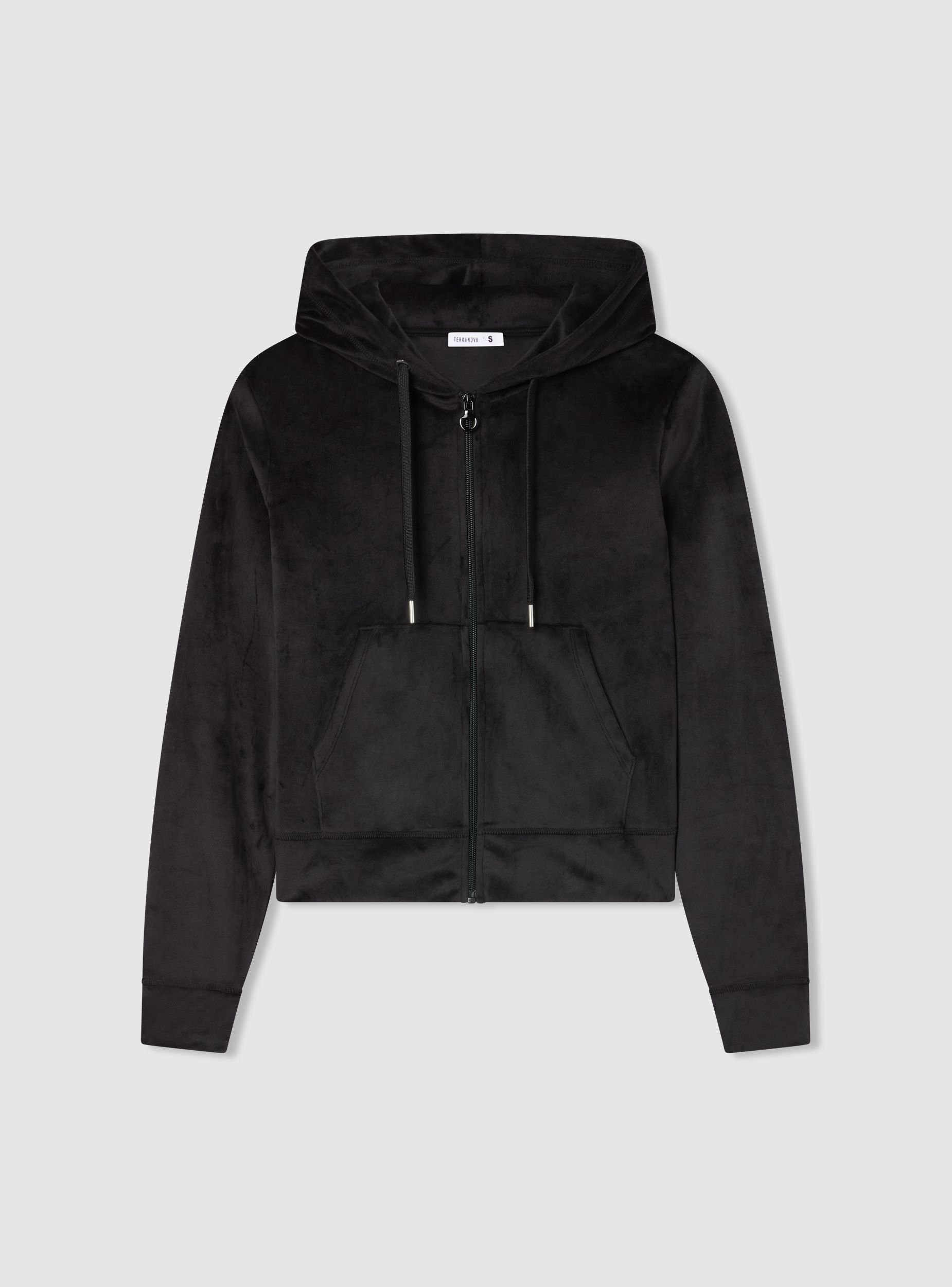 Dámska mikina z mäkkej zamatovej tkaniny so zipsom a nastaviteľnou kapucňou na šnúrku. Sametová textúra ju robí ideálnou pre casual chic vzhľad. S prednými vreckami je ideálna na kombinovanie s joggermi alebo džínsami pre pohodlný a trendy outfit.Detaily