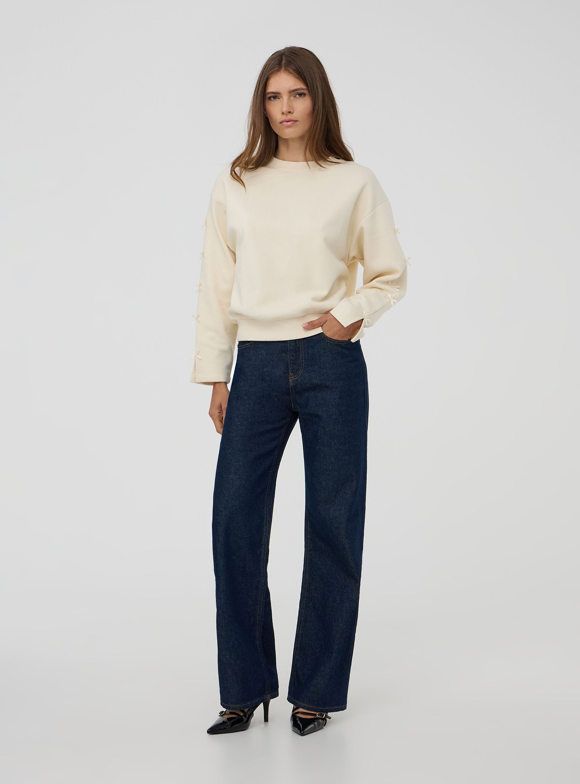 Dámska mikina vyrobená z ťažkej jednofarebnej tkaniny. Model bez kapucne s dlhými rukávmi obohatenými o aplikované mašle v tónu. Okrúhly výstrih a spodný lem s rebrovaním. Perfektná pre casual chic vzhľad. Vhodná na neformálne výlety aj na dni v kancelárii. Voľný strih.Detaily