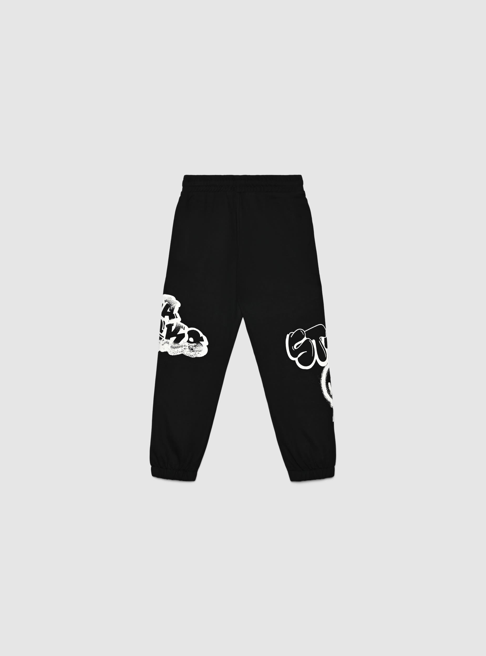 Detské teplákové nohavice s graffiti potlačou, ideálne na voľný čas a do školy. Pás s nastaviteľnou šnúrkou, spodok nohavíc s elastickými manžetami pre pohodlné nosenie. Majú šikmé bočné vrecká a pravidelný strih, perfektné na kombinovanie s mikinami a teniskami pre mestský vzhľad. Ľahká tkanina.Detaily