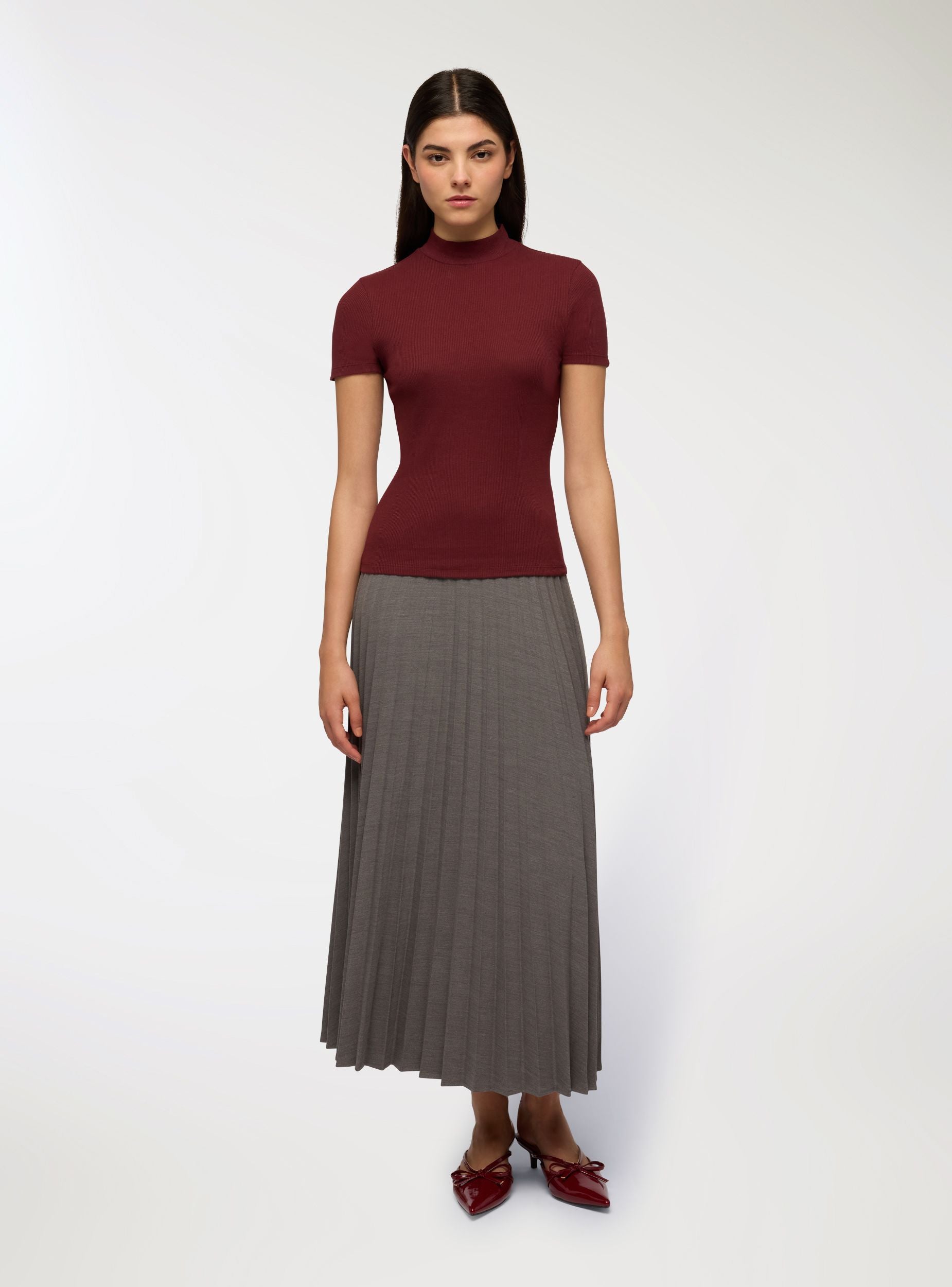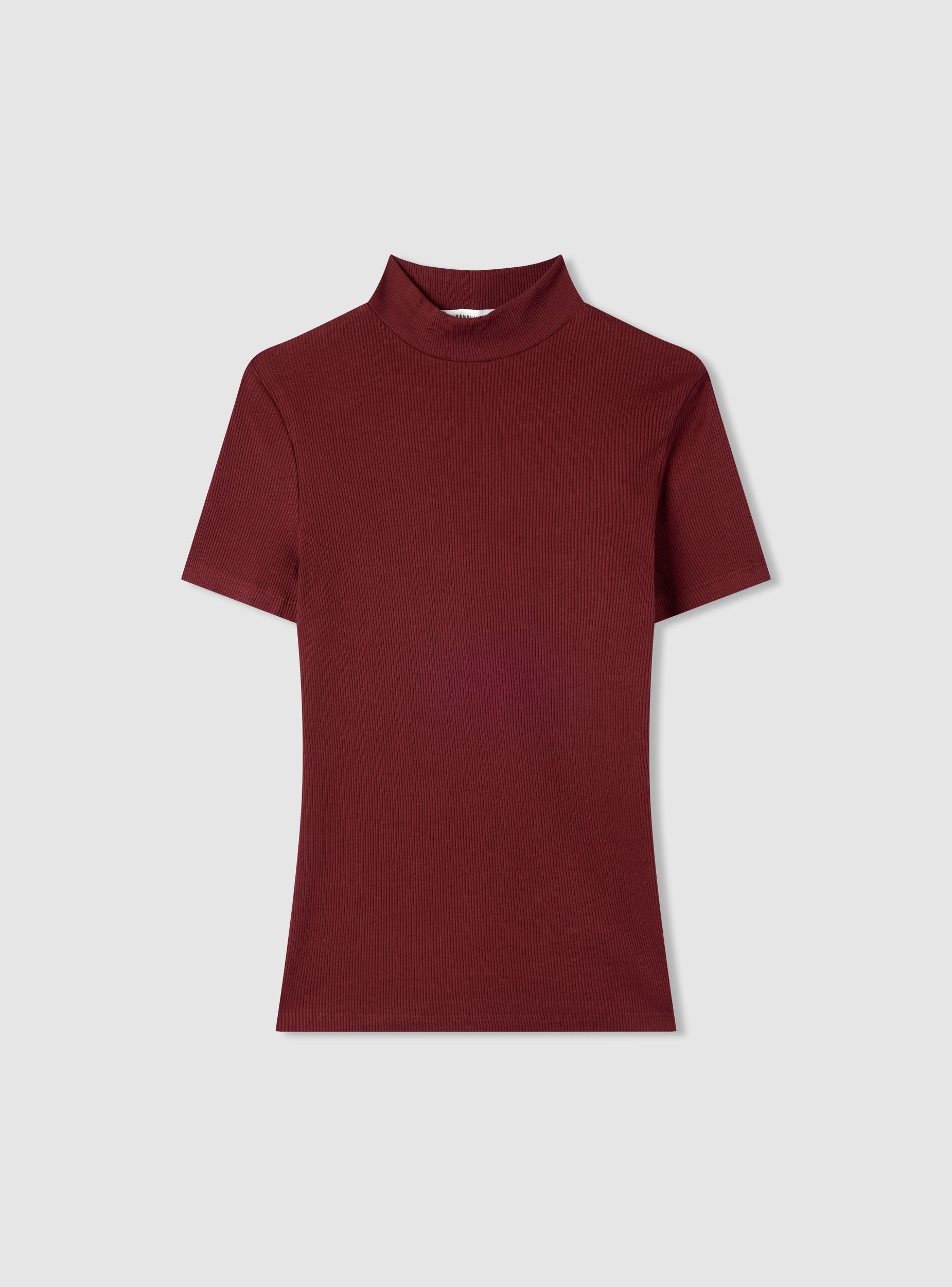 Dámska tričko s vysokým golierom z rebrovanej látky, základná a všestranná. Nezbytná a vždy aktuálna, táto tričko je základným kusom, ktorý nesmie chýbať v šatníku. Vyrobená z jednoliatej tkaniny, má krátke rukávy a úzky strih, ktorý diskrétne zvýrazňuje siluetu. Vysoký golier pridáva sofistikovaný nádych, ideálny na vytvorenie minimalistických, čistých a trendy outfitov. Noste ju samostatne v najbežnejších lookoch, alebo pod sako, otvorené košele či oversized svetre pre moderný a funkčný layering. Vďaka svojej všestrannosti sa ľahko prispôsobí každej sezóne a príležitosti, stáva sa nepostrádateľnou pre tých, ktorí milujú jednoduchý, ale starostlivo premyslený štýl.Detaily
