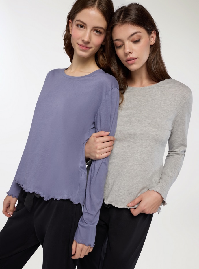 Balenie obsahuje 2 dámske tričká s dlhým rukávom, ideálne pre ležérny a všestranný vzhľad. Perfektné na kombinovanie s džínsami alebo nohavicami pre každodenný outfit. Pohodlný strih a jednofarebný dizajn ich robia vhodnými na rôzne príležitosti, od práce po voľný čas. Okrúhly výstrih a vlnitý lem pridávajú nenápadný, no elegantný štýlový detail.