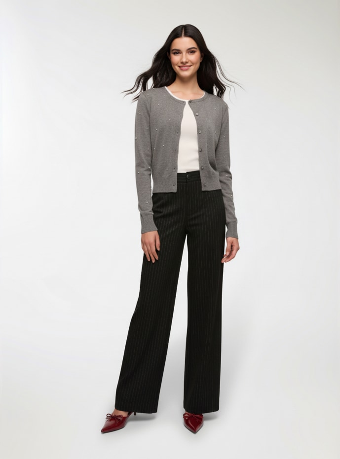 Dámsky kardigán s elegantným a univerzálnym dizajnom. Tento kardigán má zapínanie na gombíky a dekoratívne detaily s perlami, ktoré pridávajú jemný a sofistikovaný vzhľad. Je ideálny na doplnenie ležérnych alebo formálnych outfitov, dokonale sa hodí k nohaviciam alebo sukniam. Pohodlný strih a jednoduchý dizajn z neho robia nevyhnutný kúsok v šatníku.