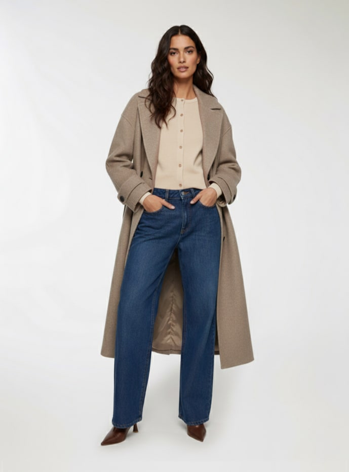 Dámsky kabát s oversized dizajnom a dvojradovým zapínaním, ideálny pre elegantný a sofistikovaný vzhľad. Vybavený zapínaním na gombíky a širokými bočnými vreckami, tento kúsok ponúka praktickosť a štýl. Perfektný na formálne príležitosti alebo na pridanie šmrncu k ležérnemu outfitu. Oversized strih zaručuje pohodlie a všestrannosť, vďaka čomu je nevyhnutným kúskom sezóny.