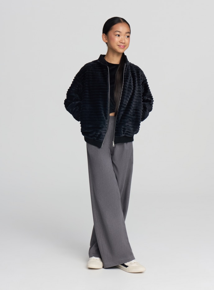 Dievčenská bomber bunda, ideálna na prechodné obdobie a voľný čas. Vyrobená z materiálu s efektom kožušiny a horizontálnym rebrovaním. Má golier, manžety a spodný lem z rebrovanej pleteniny, predné zapínanie na zips. Regular strih umožňuje vrstvenie s mikinami alebo tričkami. Ideálna s džínsami a teniskami pre mäkký a pohodlný mestský vzhľad v jednofarebnom prevedení.