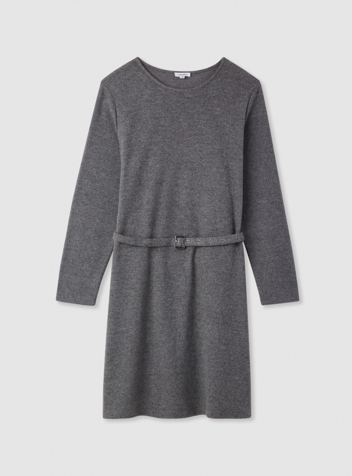 Dámske šaty v jednofarebnom prevedení s okrúhlym výstrihom a dlhými rukávmi. Rovný strih zvýraznený tenkým opaskom s prackou v páse na definovanie siluety. Dĺžka nad kolená. Ľahko kombinovateľné s čižmami alebo teniskami na voľný čas a s blejzrom alebo trenčkotom do kancelárie. Pohodlný strih a čistý dizajn, ktorý sa ľahko kombinuje.