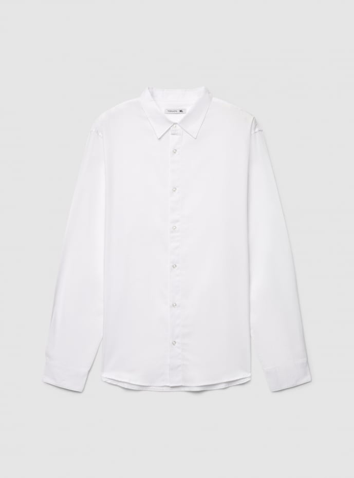 Pánska košeľa jednofarebná, navrhnutá pre kancelárske a upravené príležitosti. Dizajn so špicatým golierom a predným zapínaním zdôrazňuje čistý štýl, zatiaľ čo zaoblený spodok umožňuje nosiť ju buď zastrčenú do nohavíc, alebo voľne. Dlhé rukávy s gombíkovými manžetami a strih bez vreciek, ideálna s chinos nohavicami alebo džínsami pre upravený vzhľad.