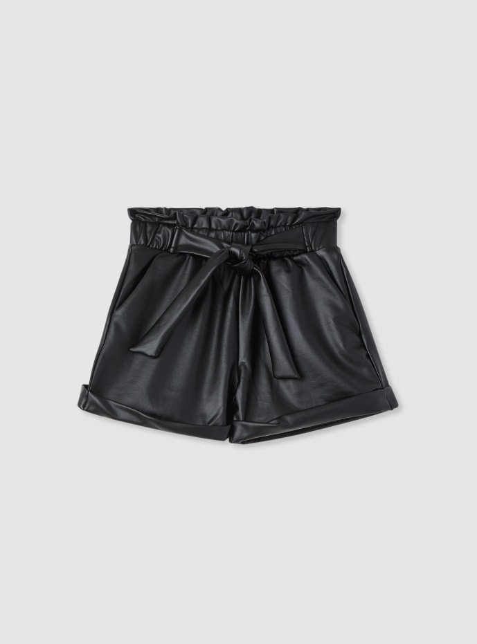 Dievčenské šortky s papierovým pásom a zaväzovacím opaskom, ideálne pre mestský štýl aj špeciálne príležitosti. Jednofarebný dizajn s efektom kože, s manžetou na spodnom okraji a voľným strihom, ktorý zabezpečuje pohodlie pri pohybe. Kombinujte s tričkom a teniskami počas dňa alebo s košeľou pre elegantnejší outfit.