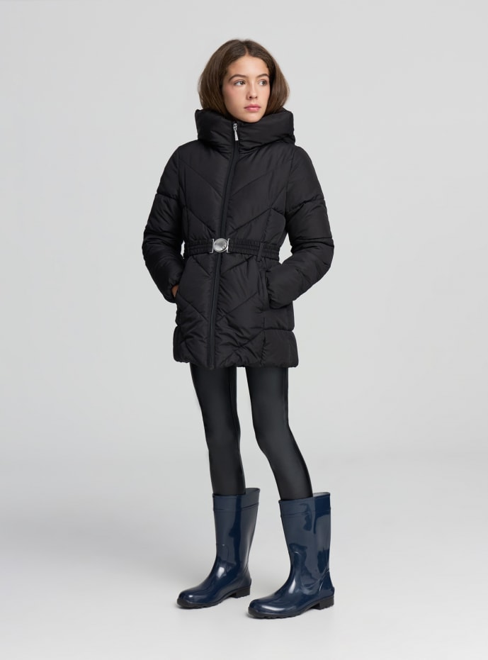 Detská prešívaná bunda s kapucňou, ideálna na chladné dni. Má predné zapínanie na zips a elastický opasok s dekoratívnou prackou pre nastaviteľné nosenie. Bočné vrecká poskytujú praktickosť, zatiaľ čo prešívaný dizajn dodáva moderný vzhľad. Ideálna na doplnenie ležérneho outfitu a zabezpečenie ochrany pred chladom.