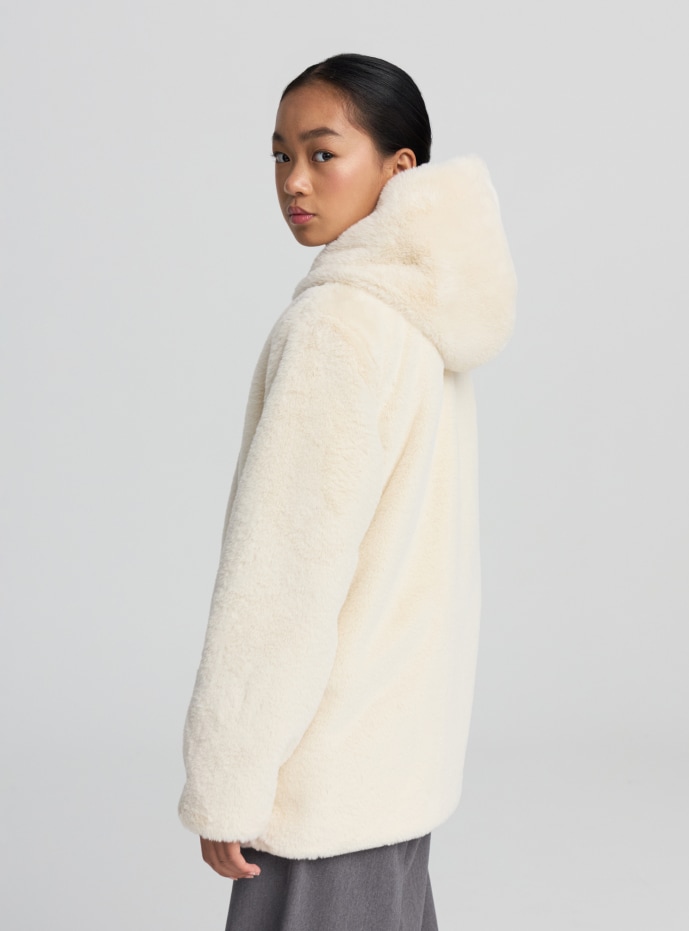 Detská umelá kožušina s kapucňou, ideálna na chladné dni. Má zapínanie na gombíky a bočné vrecká pre väčšiu praktickosť. Pravidelný strih ju robí pohodlnou a vhodnou na rôzne príležitosti. Perfektná na doplnenie neformálnych outfitov a zaručuje teplo a štýl.