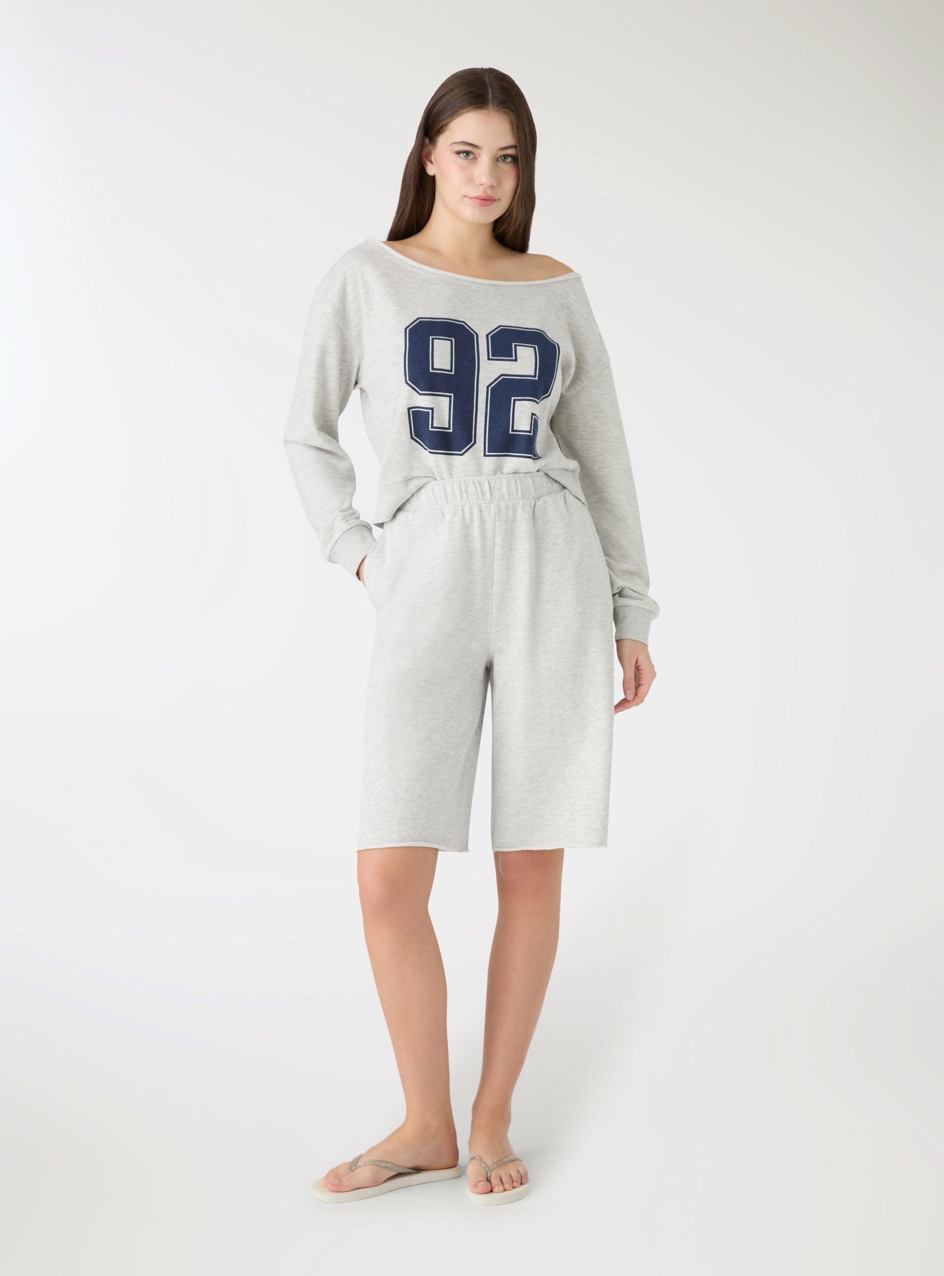 Bluza cropped për gra me print numri në pjesën e përparme për një pamje sportive. Gji i hapur në formë varke, mëngë të gjata dhe funde me rripa elastikë për një përshtatje të rehatshme. Model pa kapuç dhe pa zinxhir. Ideale për kohën e lirë ose për veshje casual me xhinse me bel të lartë ose joggers. Tkanje e lehtë.Detajet
