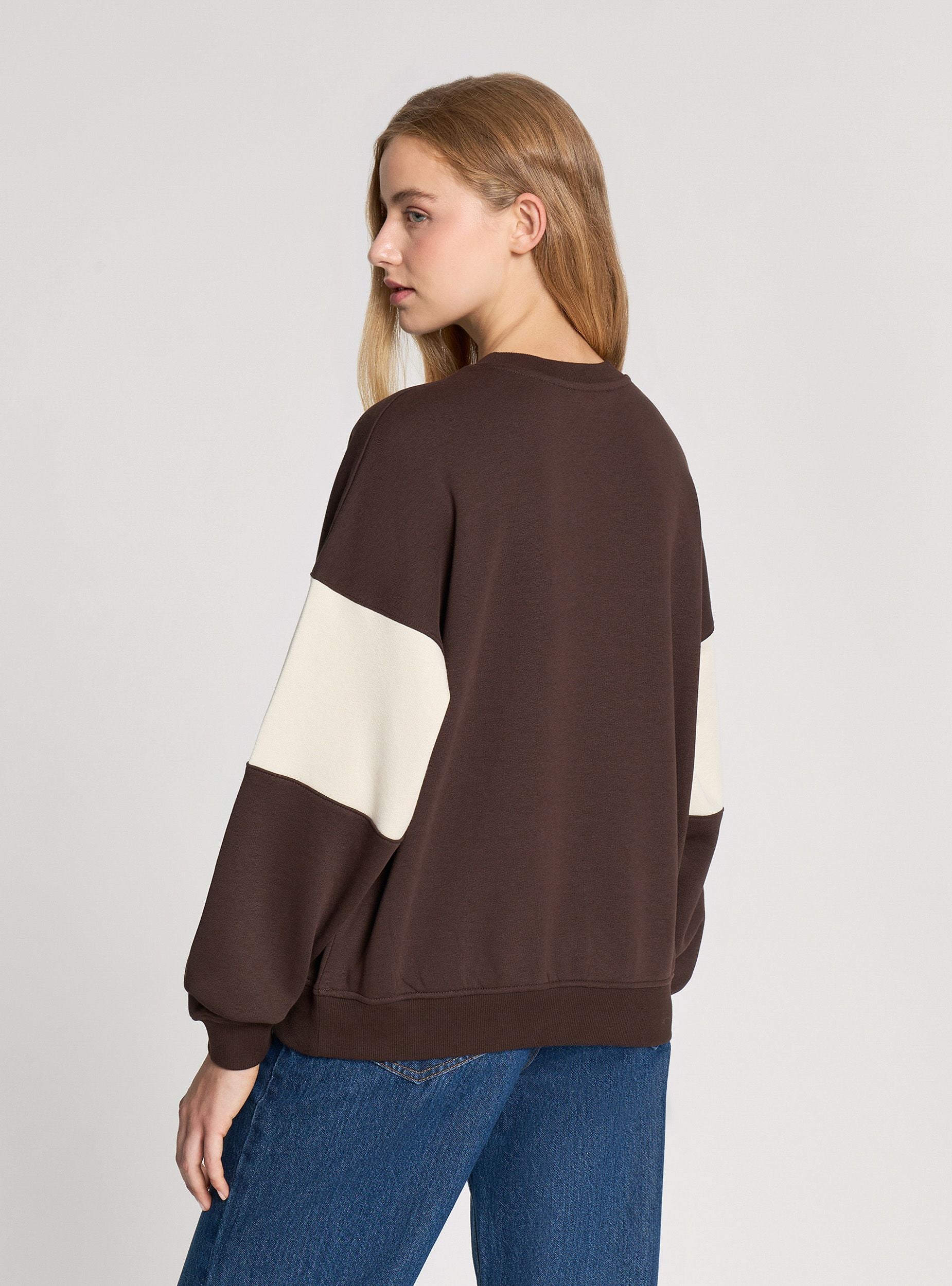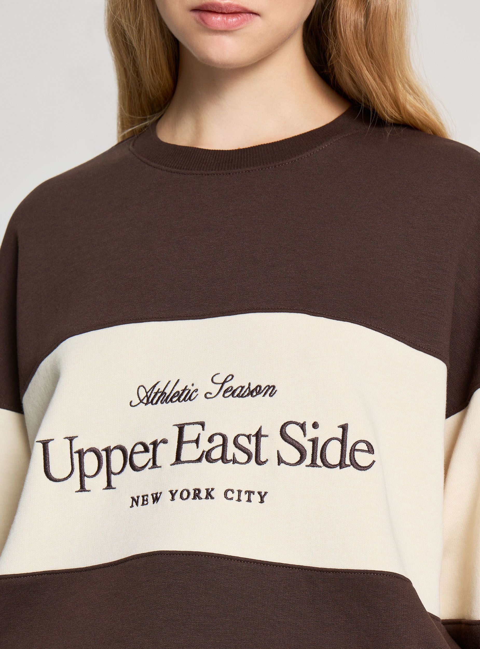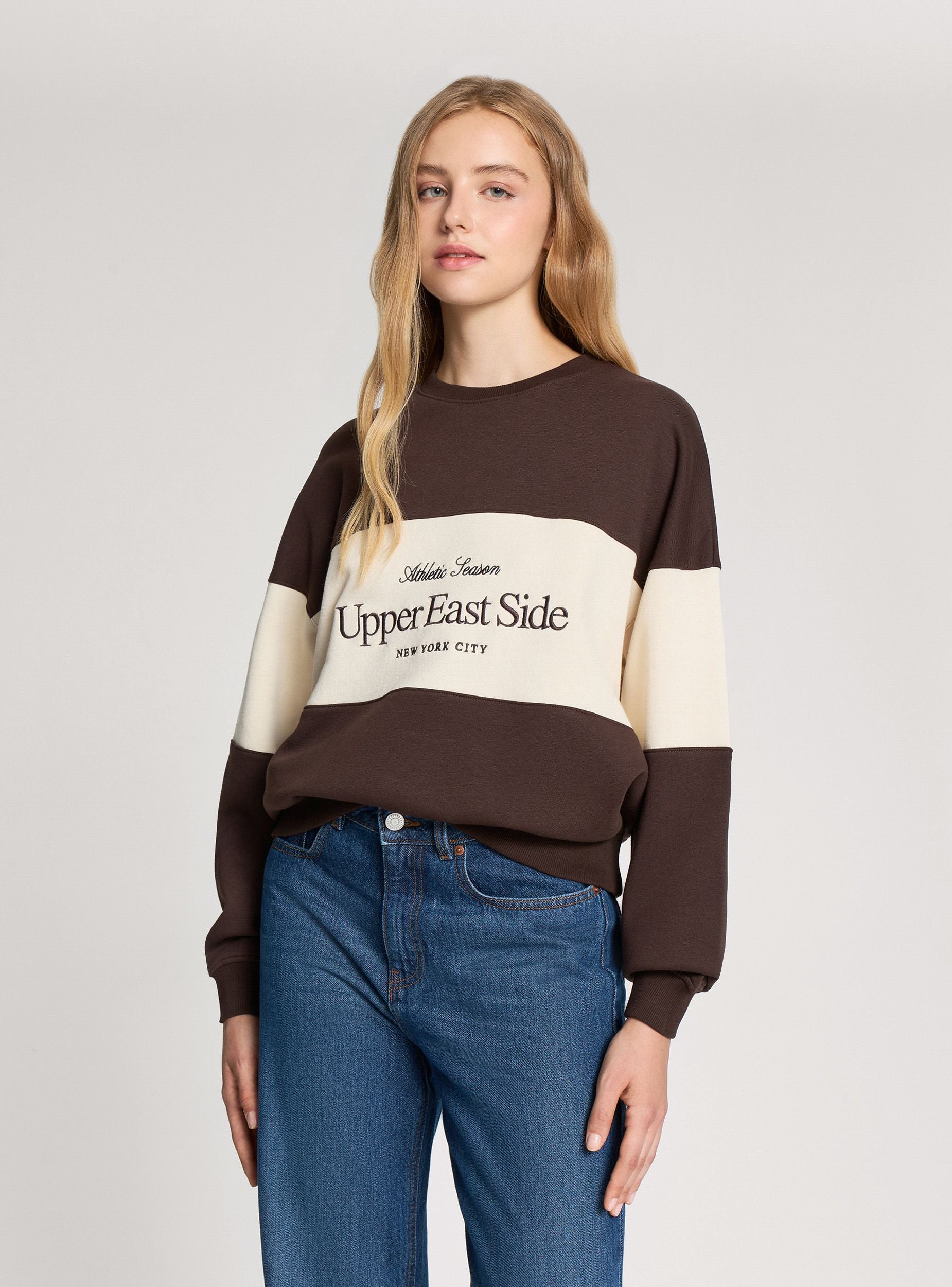 Mikrofibra e rëndë për gra, ideale për pamjet e rastësishme të sezonit të ftohtë. Model pa kapuç dhe pa zip, i karakterizuar nga një grafikë kolegjiale të qëndisur në pjesën e përparme që i referohet estetikës amerikane. Dizajni me ngjyra të bllokuara me elemente kontrastante në mëngë i jep një prekje sportive dhe dinamike. Përshtatja është e gjerë dhe e rehatshme me mansheta dhe fund në kostum, e përsosur për t'u kombinuar me xhinse ose pantallona jogger.Detajet