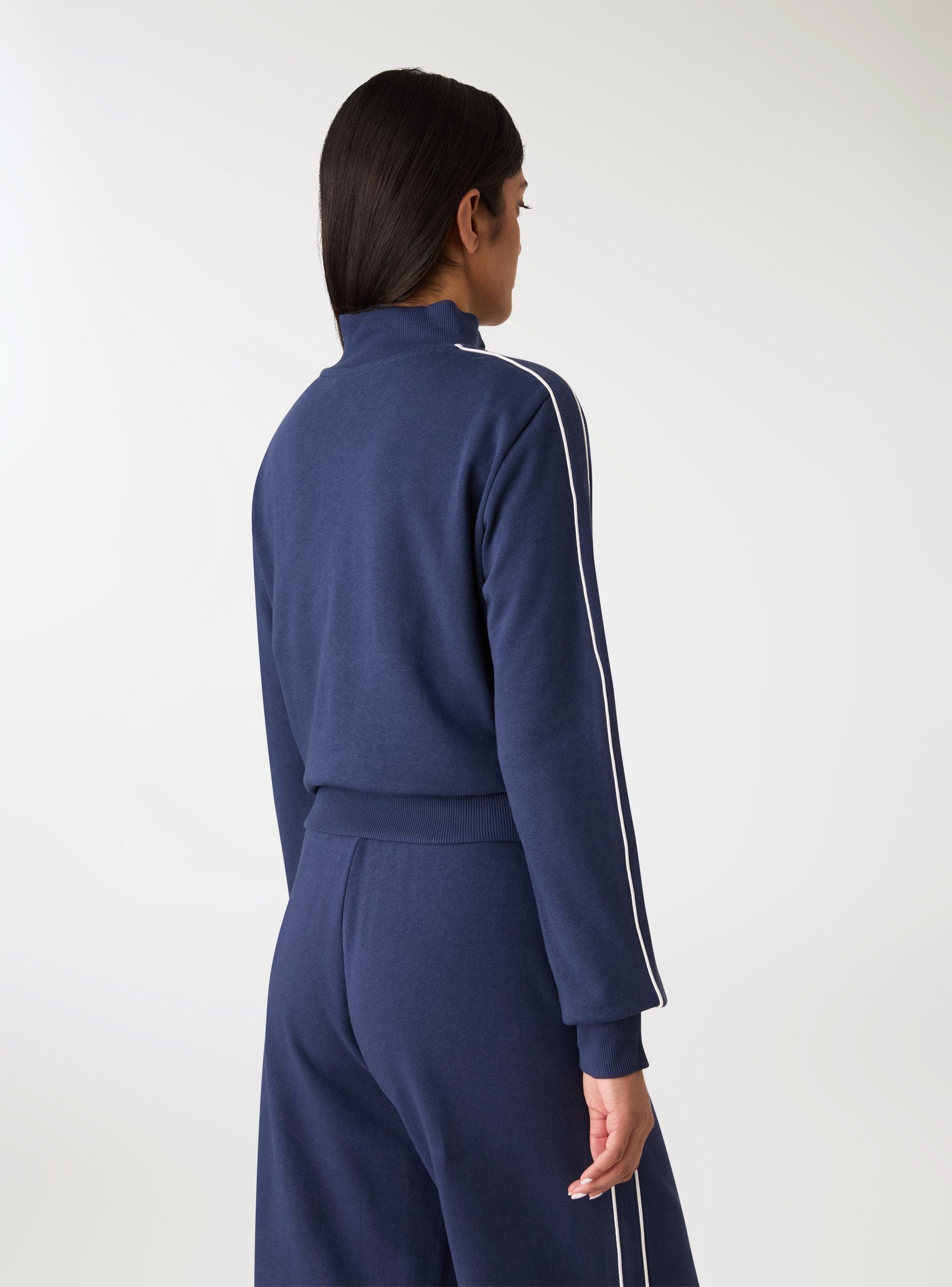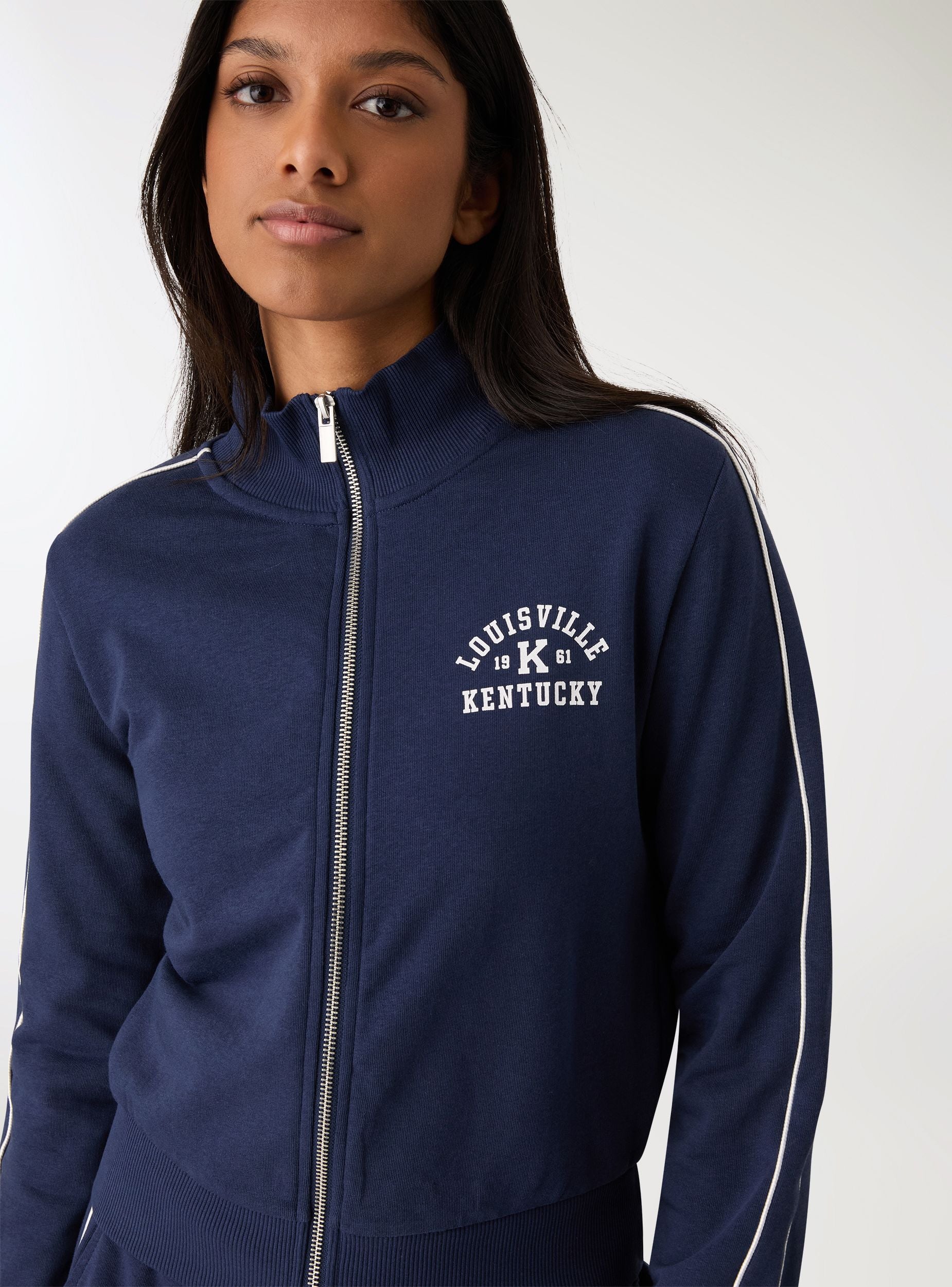 Hanorac femrash me zip dhe qafë të lartë, ideal për stil urban dhe kohë të lirë. Dizajn me print kolegji në gjoks, profile kontrasti përgjatë mëngëve dhe funde dhe krahë me trikotazh të valëzuar për një përshtatje të rehatshme. Pa kapuç, me mëngë të gjata dhe zip metalik në pjesën e përparme. I përshtatshëm mbi topa dhe xhinse ose i kombinuar me pantallona sportivë për një veshje sportive me stil modern.Detajet