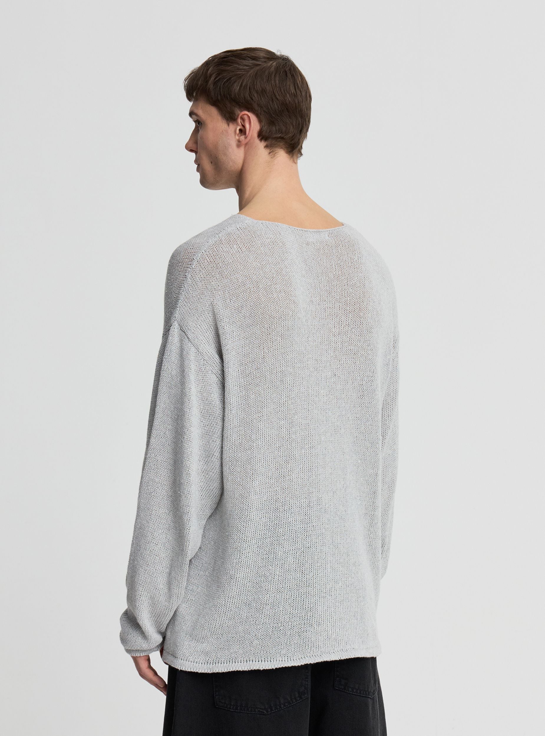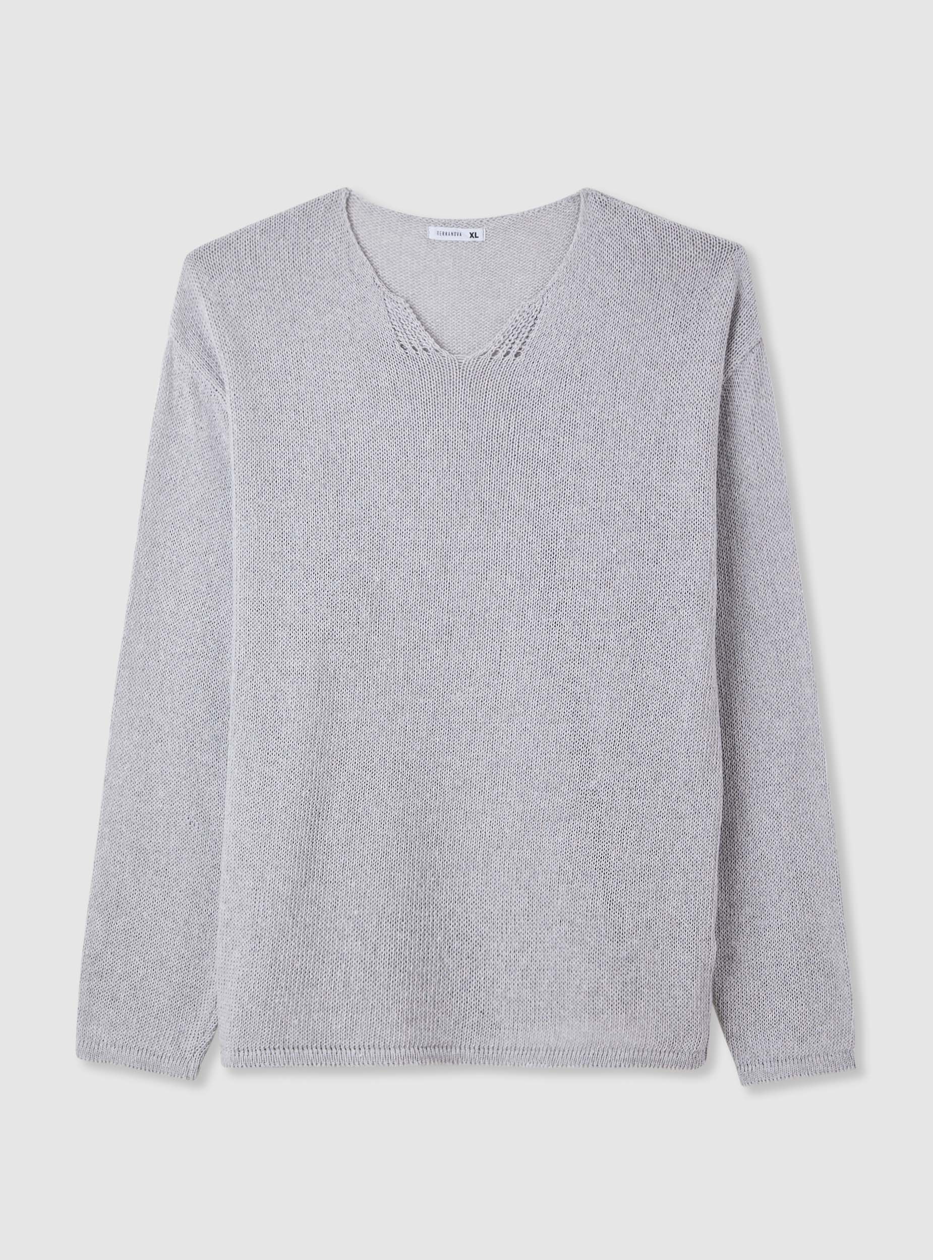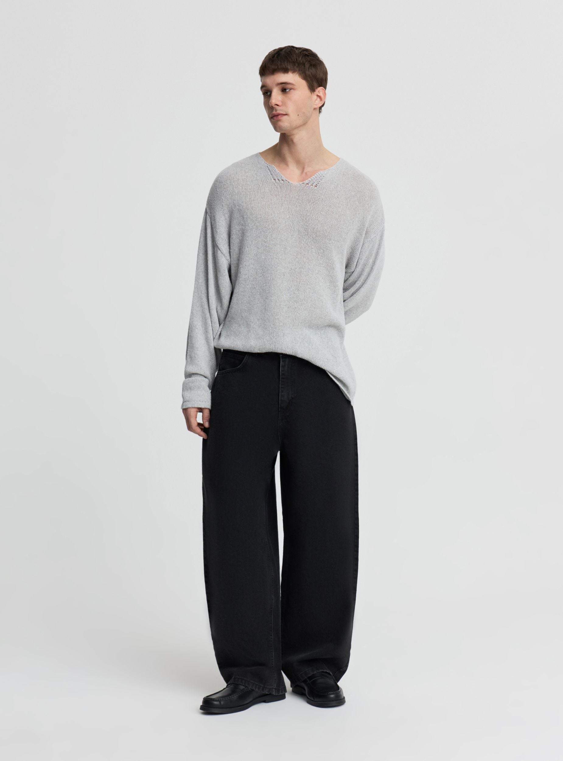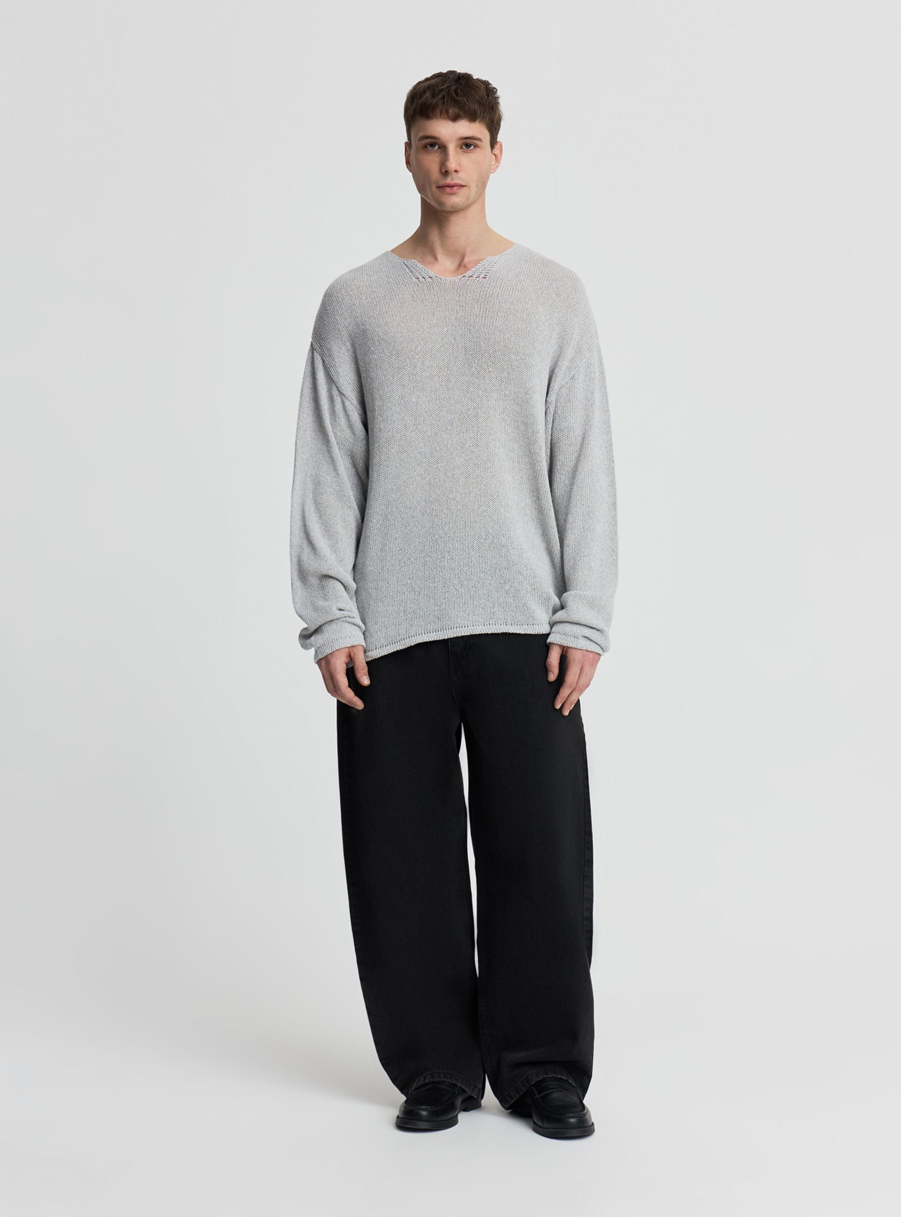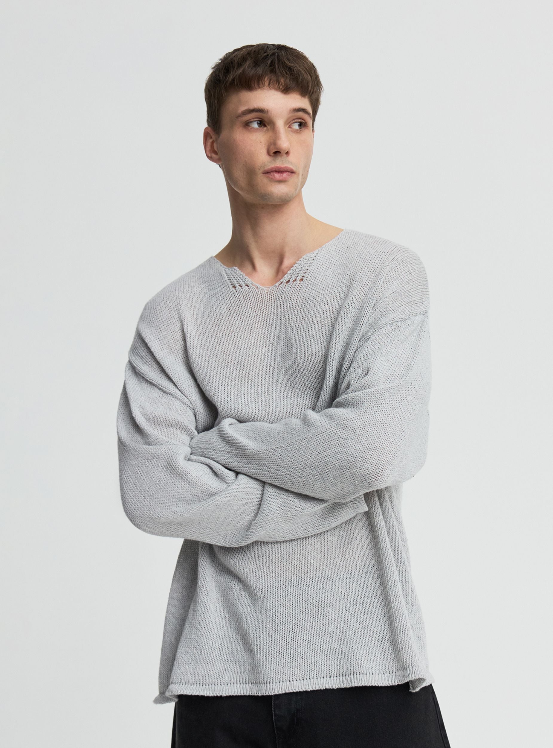 Triko për burrat me ngjyrë të njëtrajtshme, me qafë V dhe detaj të prerë në pjesën e përparme. Prerja boxy ofron një përshtatje të rehatshme, ideale për t’u veshur mbi një këmishë ose me një t-shirt për një stil casual dhe urban. Mëngë të gjata me funde dhe mansheta me rrjeta, pa mbyllje dhe pa xhepa, perfekte me xhinse ose pantallona chino.Detajet