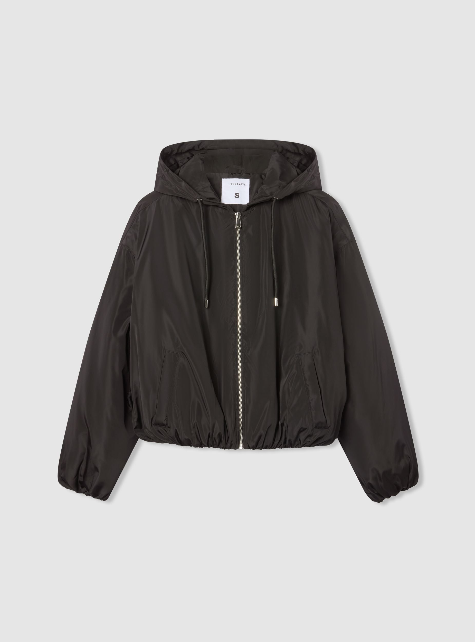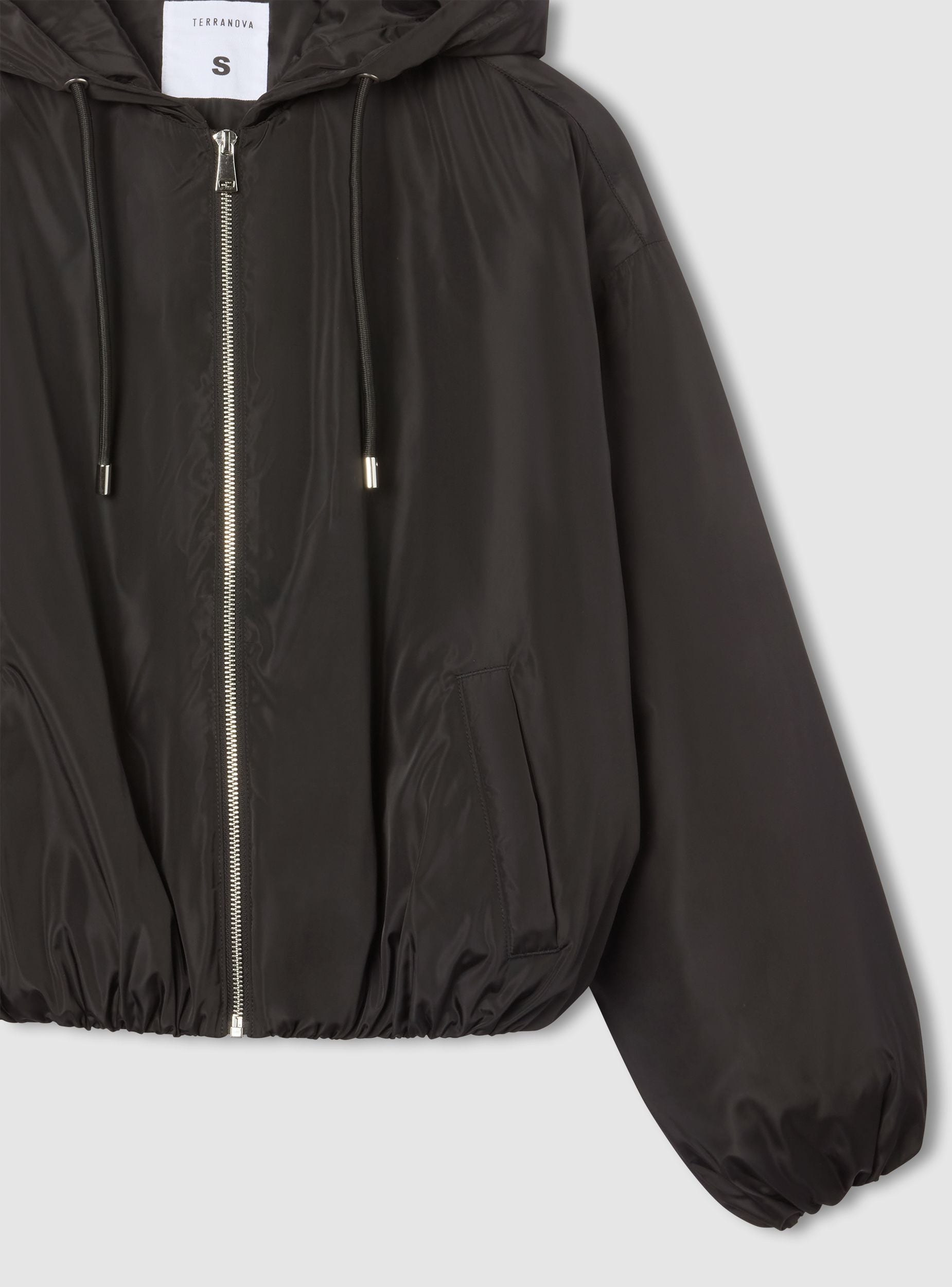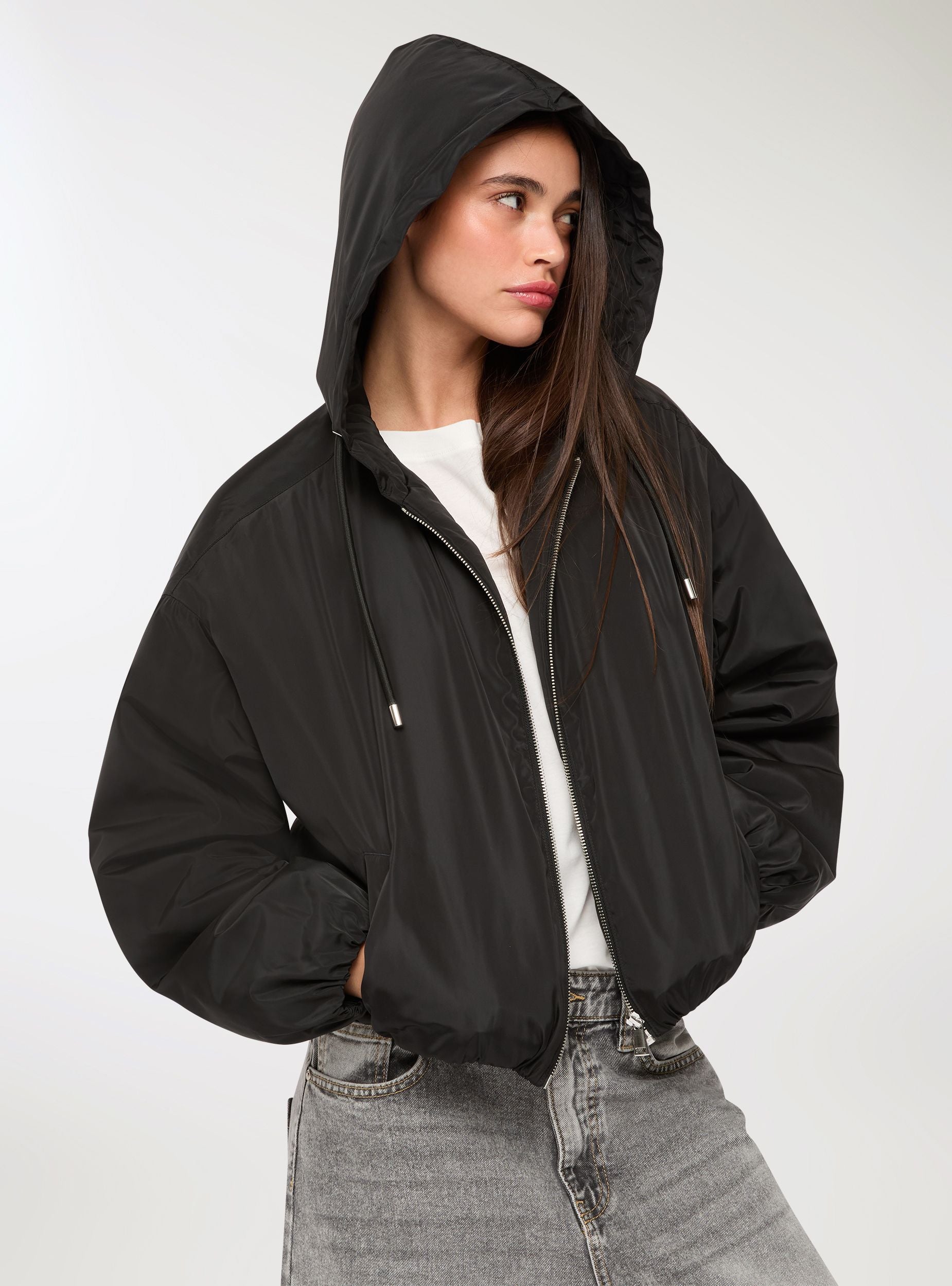 Bomber për gra me kapuç dhe rrip tërheqës, ideal për një pamje të rastësishme dhe moderne. I pajisur me mbyllje me zinxhir dhe xhepa anësorë, ofron praktikë dhe stil. Përshtatja e rregullt e bën të përshtatshëm për t’u veshur mbi bluzat ose pulovrat, duke u përshtatur me raste të ndryshme. Dizajni me ngjyrë të vetme e bën të shumëanshëm dhe të lehtë për t’u kombinuar me xhinse ose pantallona sportive.Detajet