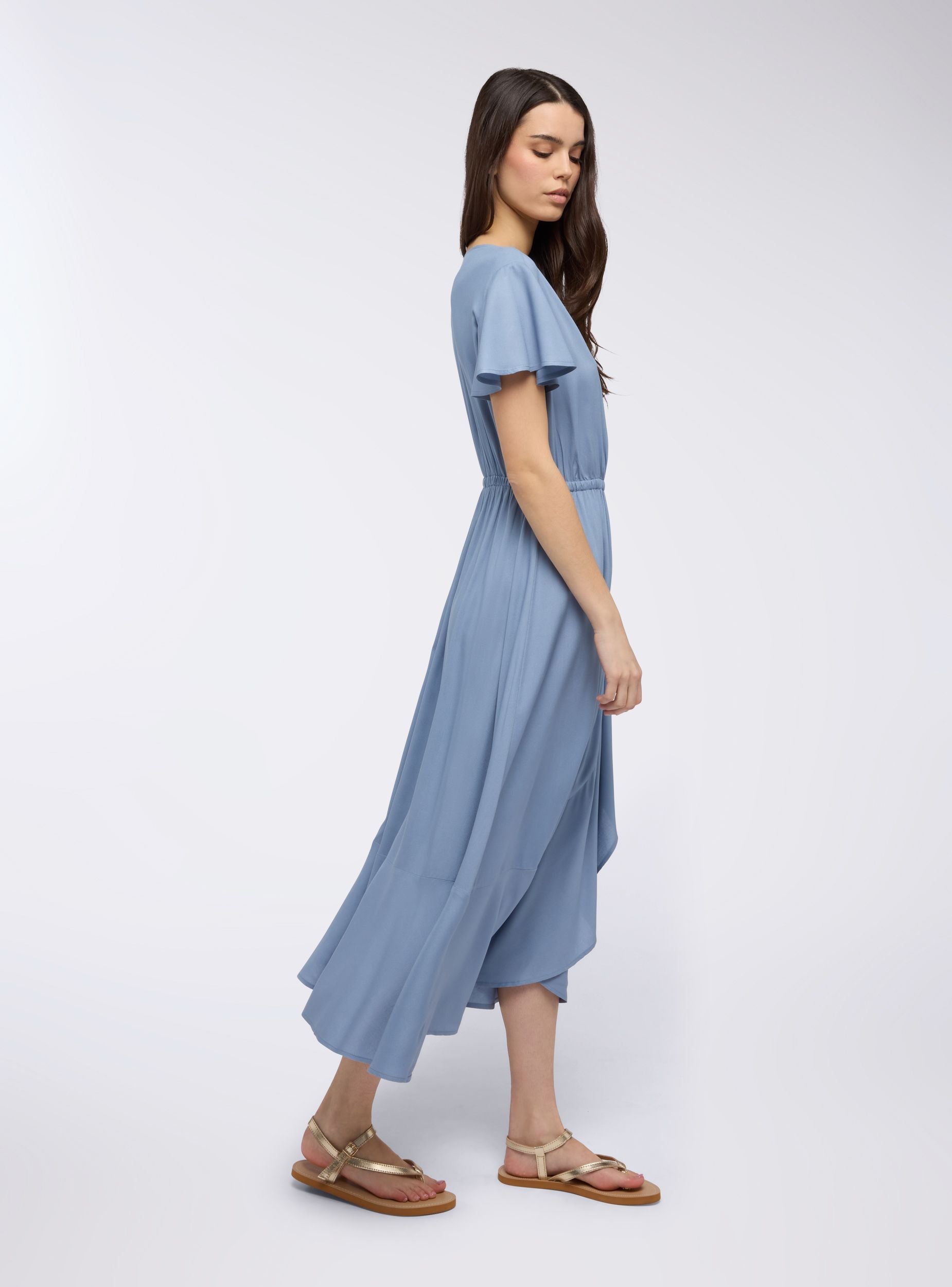 Fustan i gjatë dhe elegant për gra, perfekt për ceremonia, aperitivë ose shëtitje verore. Fustani i mbështjellë përfshin siluetën me feminitet, ndërsa ngjyra e njëtrajtshme e bën atë të shumëanshëm dhe të rafinuar. Dekolteja në formë V thekson dekoltenë, dhe mëngët e shkurtra shtojnë një prekje lehtësie. Ideale me sandale të ulëta për një pamje të përditshme ose me taka dhe aksesorë për një rast special.Detajet