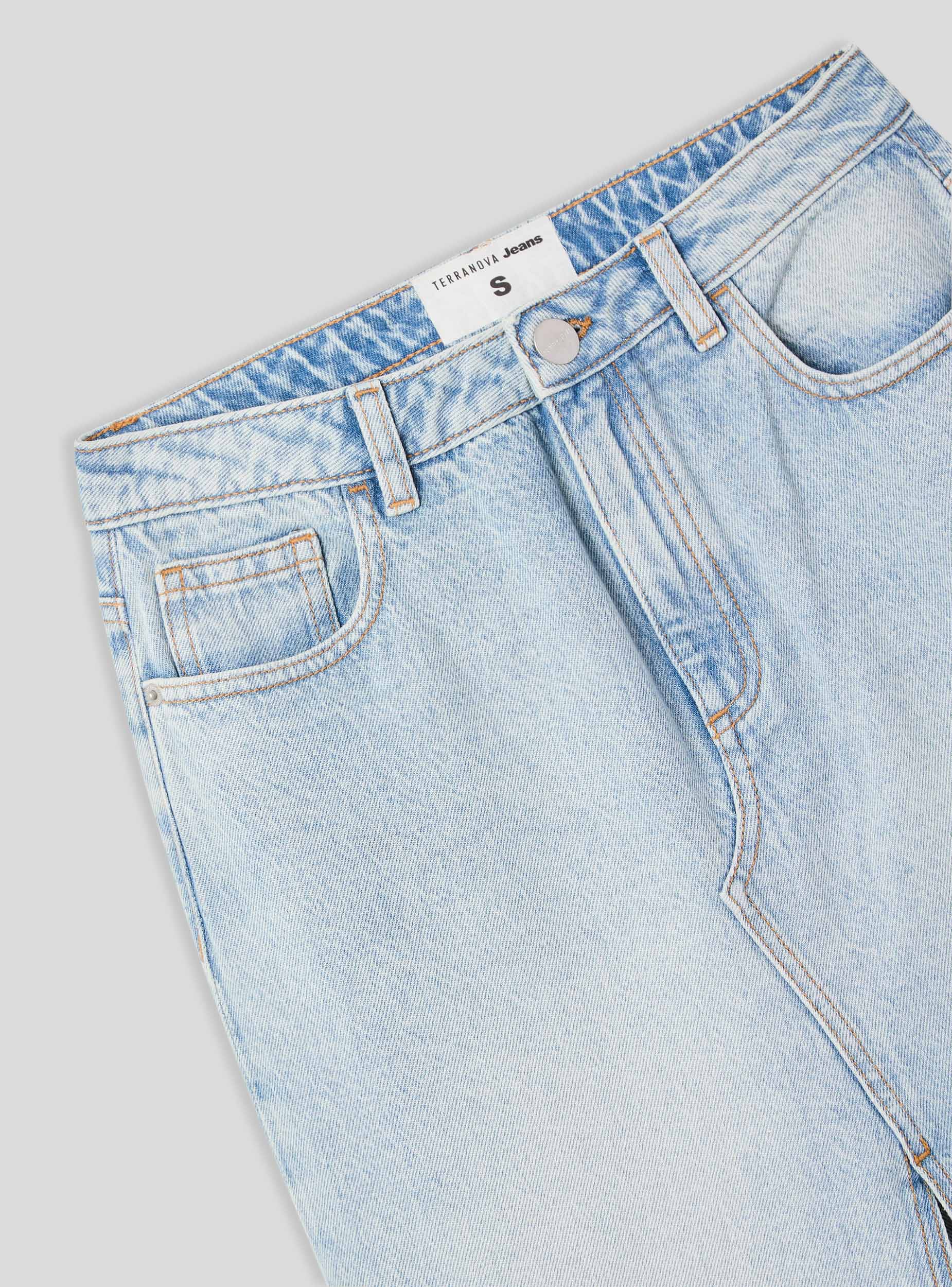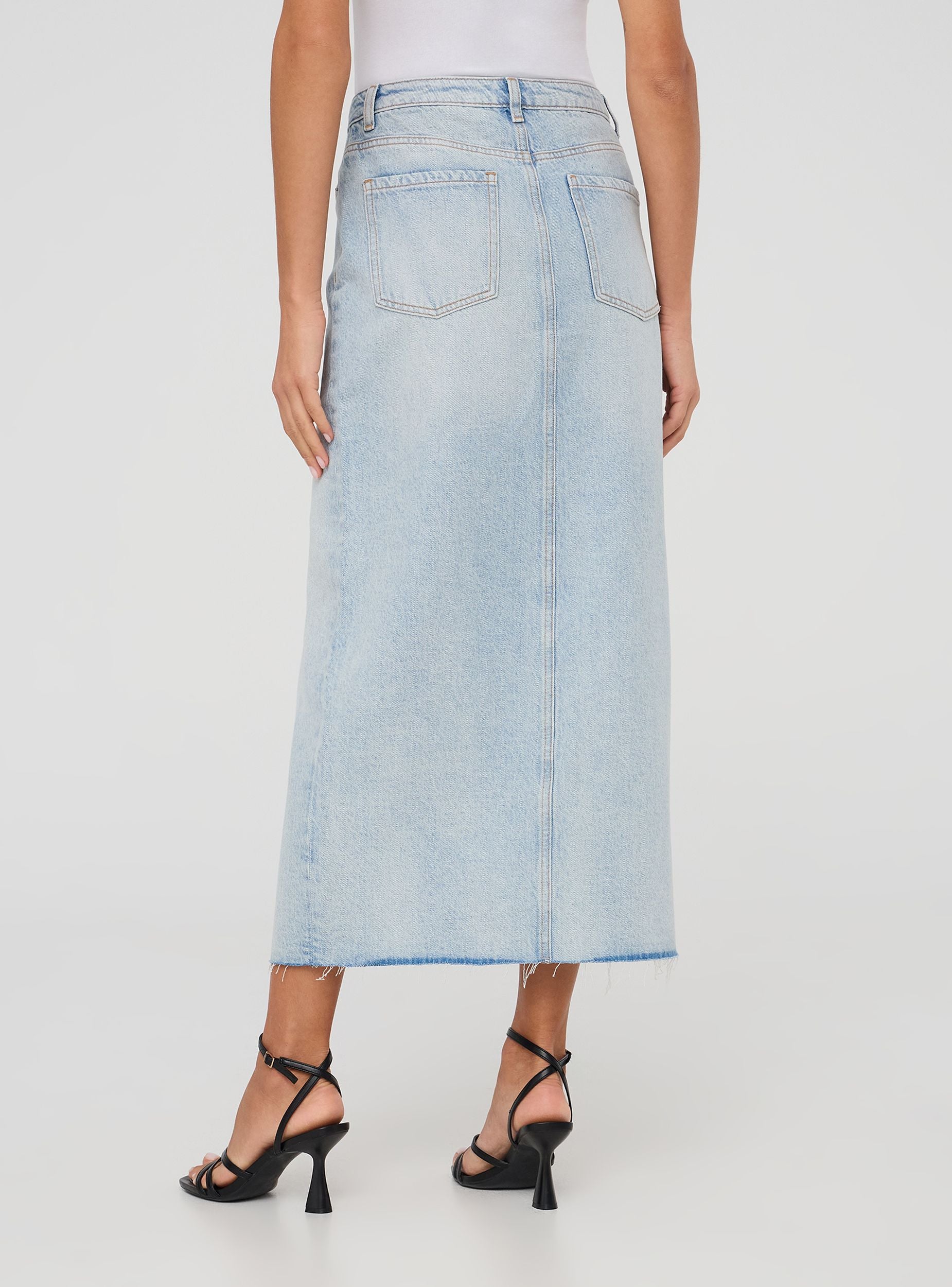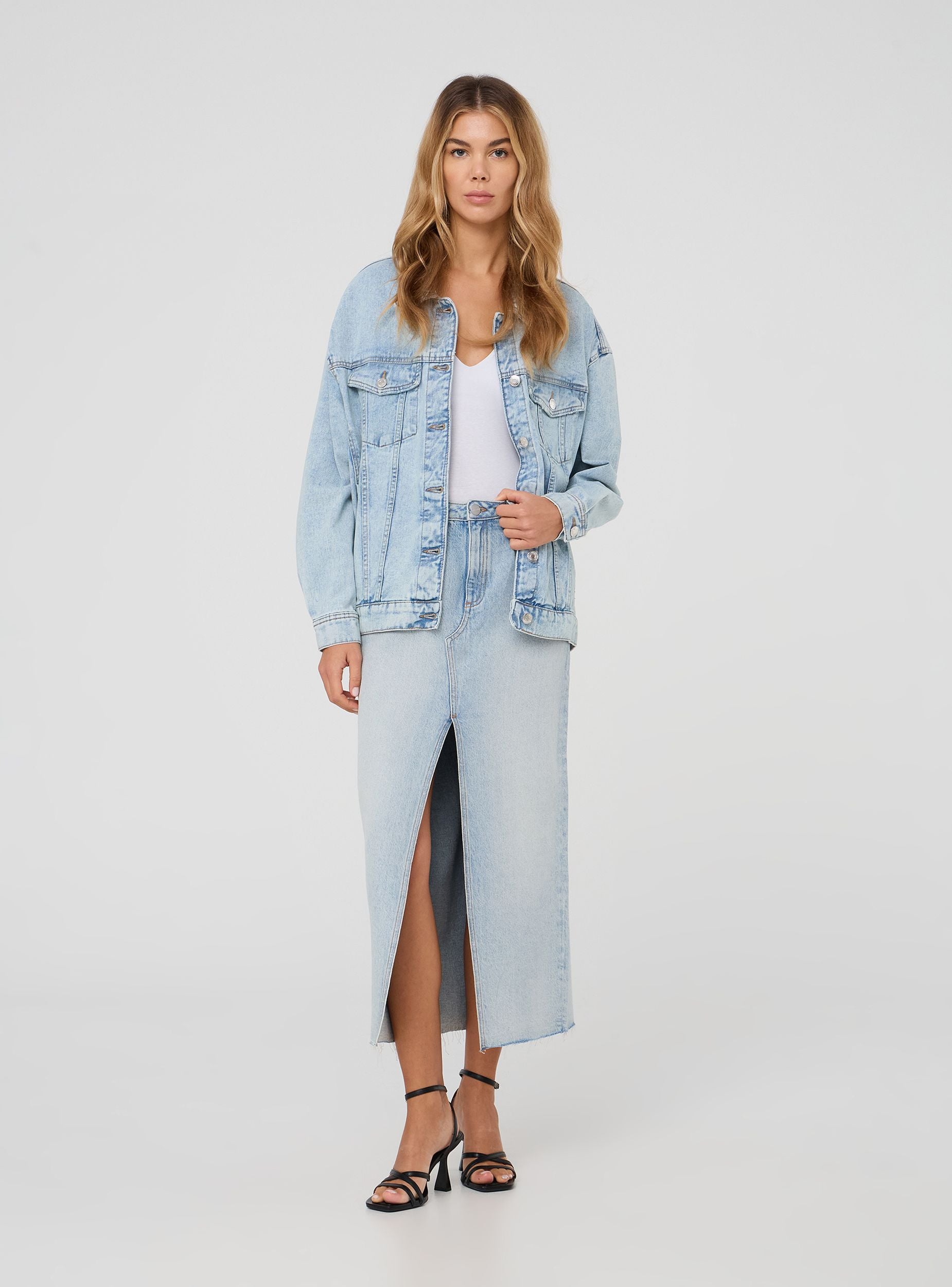 Fustan i gjatë dhe femëror me ngjyrë të njëtrajtshme, i bërë nga denim i lehtë. I karakterizuar nga një çarje në pjesën e përparme që i jep një prekje moderne dhe shumëllojshmërie. I pajisur me mbyllje me button dhe zip, rripa në bel dhe pesë xhepa praktikë, është perfekt për një pamje të rastësishme dhe të lirshme, i përshtatshëm për çdo rast.Detajet