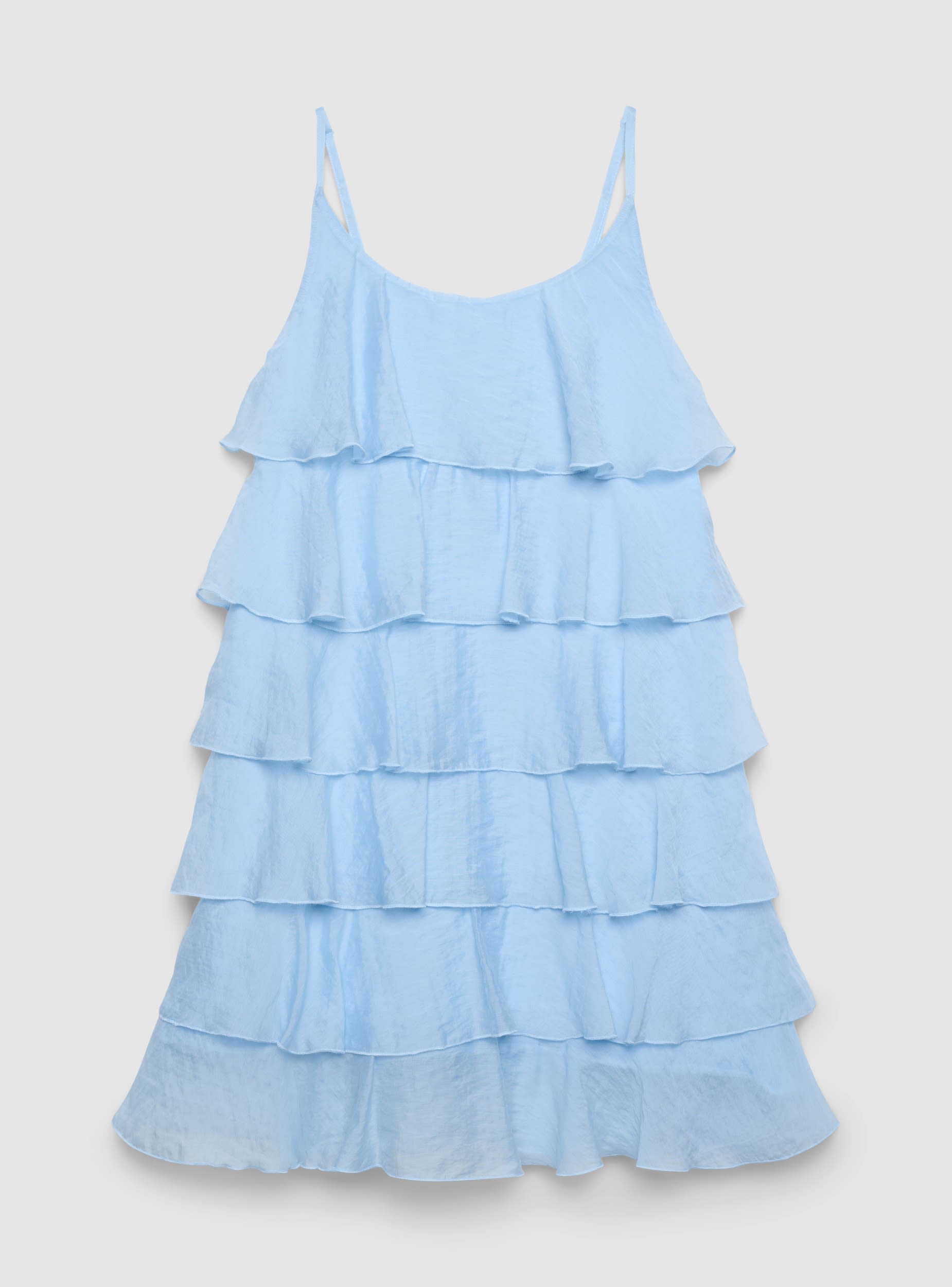 Fustan gruaje me ngjyrë të vetme me rripa të hollë të rregullueshëm dhe qafë të rrumbullakët. Dizajni me shtresa të mbivendosura i jep lëvizshmëri dhe një linjë të butë, ideal për pamje verore dhe për aperitivë ose raste të veçanta joformale. Mund të kombinohet me sandale dhe çantë dore, ose me një xhaketë të lehtë për mbrëmjen.Detajet