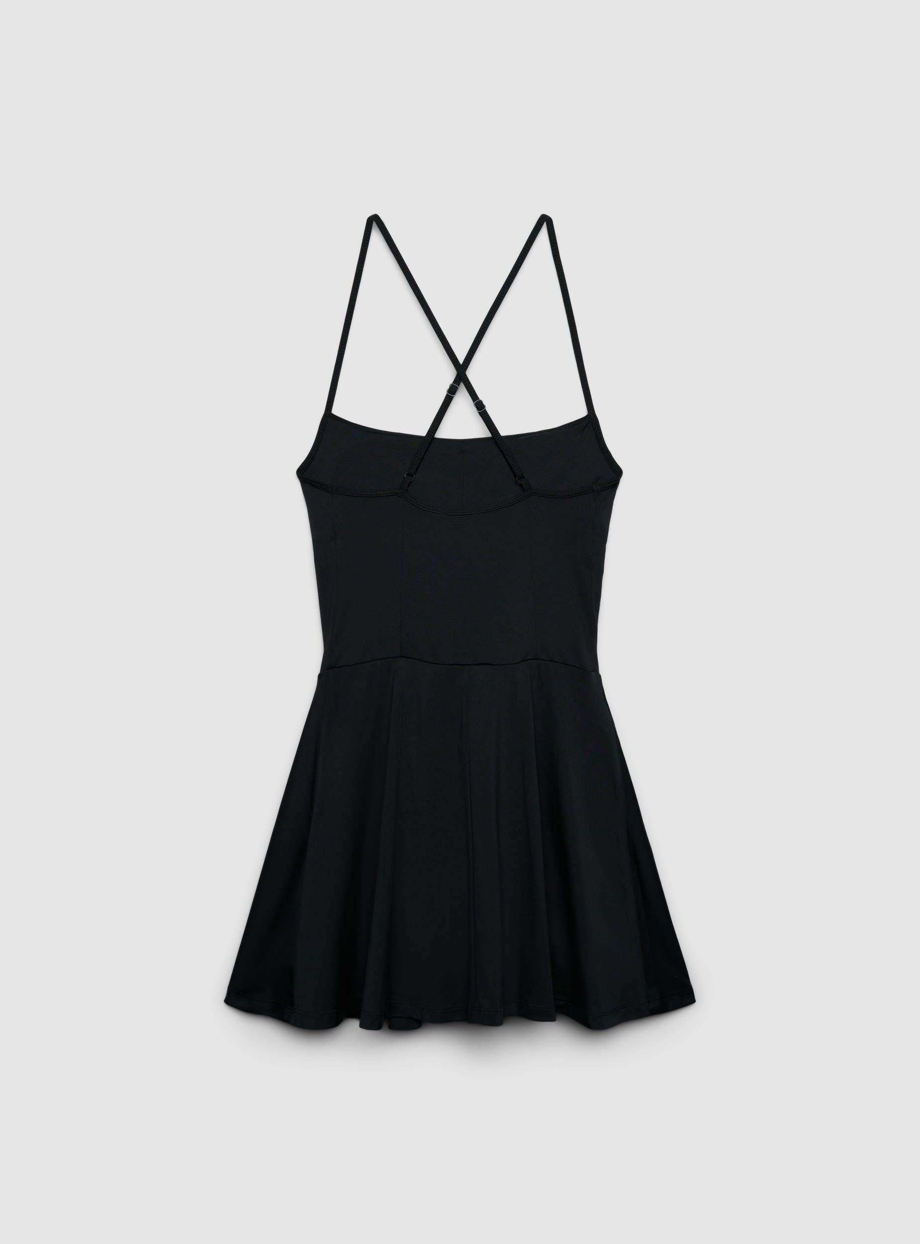 Fustan gruaje me ngjyrë të vetme me dizajn skort, ideal për mbrëmje dhe festa. Korpeti me kupa mbështet dhe thekson, ndërsa dekolteja e drejtë dhe rripat e hollë të kryqëzuar në shpinë shtojnë një detaj të fuqishëm. Fundi i shkurtër dhe i zgjeruar jep lëvizje dhe thekson figurën, perfekt me sandale ose këpucë sportive për një stil më urban.Detajet