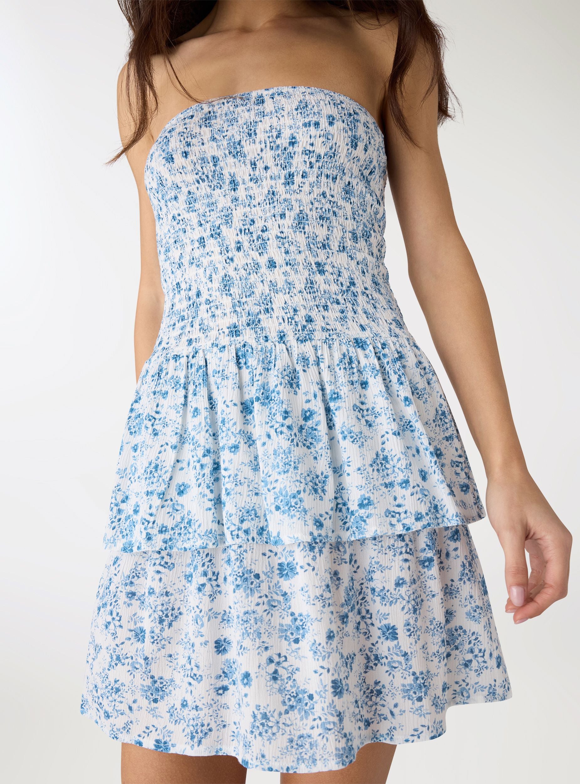 Fustan grash me rrip, me printim floral, ideal për ditët e verës dhe pushimet. Korpusi elastik përshtatet me bustin dhe thekson figurën, ndërsa fundi me shtresa i jep lëvizshmëri dhe lehtësi. Dizajn i lehtë për t’u kombinuar me sandale dhe çantë të thurur për një pamje ditore ose plazhi.Detajet