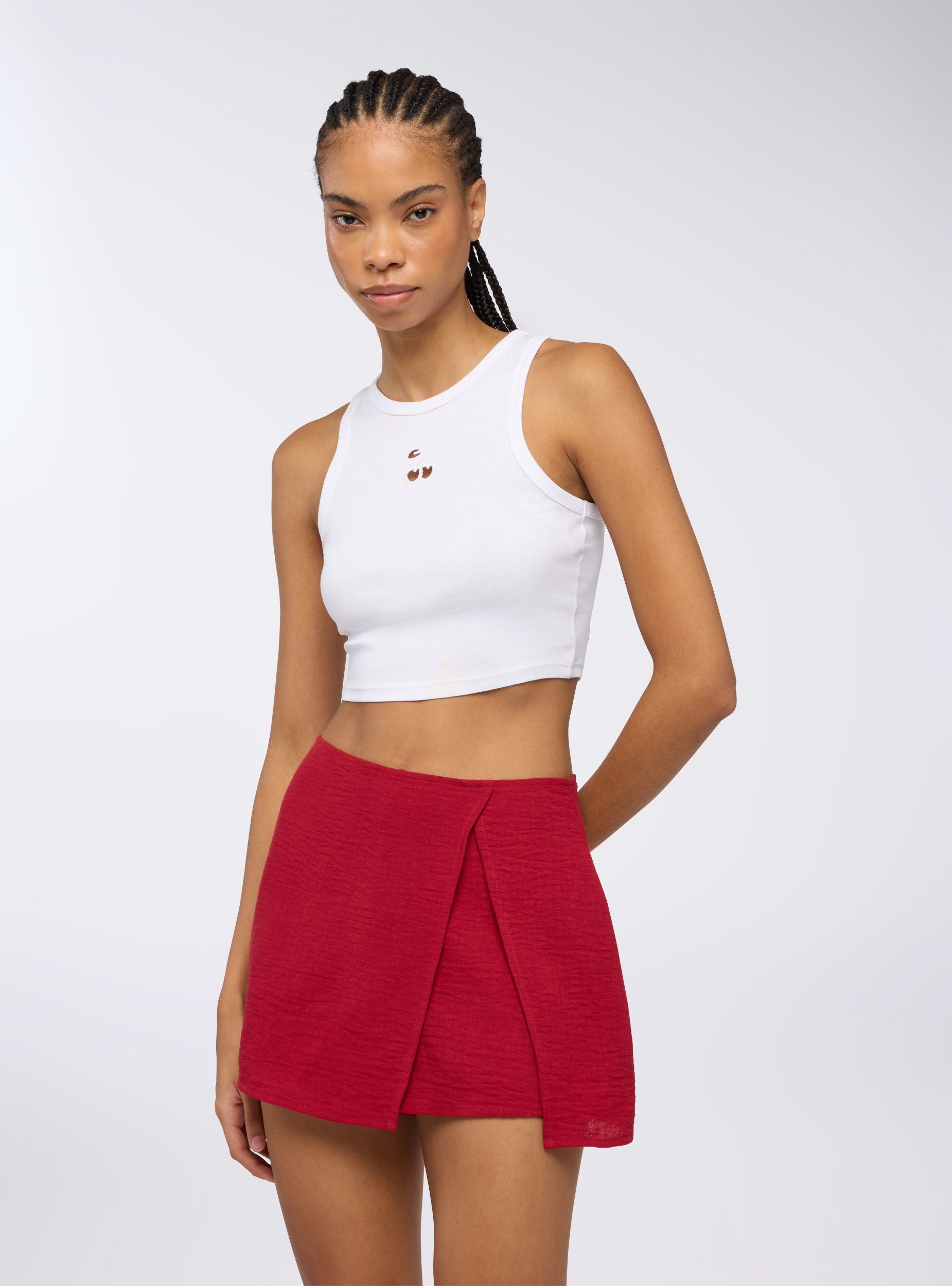 Pantallona Gonna për gra me një dizajn të rafinuar dhe shumëanshëm, ideale për një pamje të kujdesshme si gjatë ditës ashtu edhe në mbrëmje. Prerja e pastër dhe ngjyra e vetme e bëjnë atë të përsosur për t'u kombinuar me bluzat e ngushta ose bluzat e buta, ndërsa zinxhiri i fshehur në pjesën e prapme siguron një mbyllje diskrete. Efekti i linit i jep një prekje sofistikuar, perfekt për raste elegante ose veshje casual chic me atlete ose sandale.Detajet