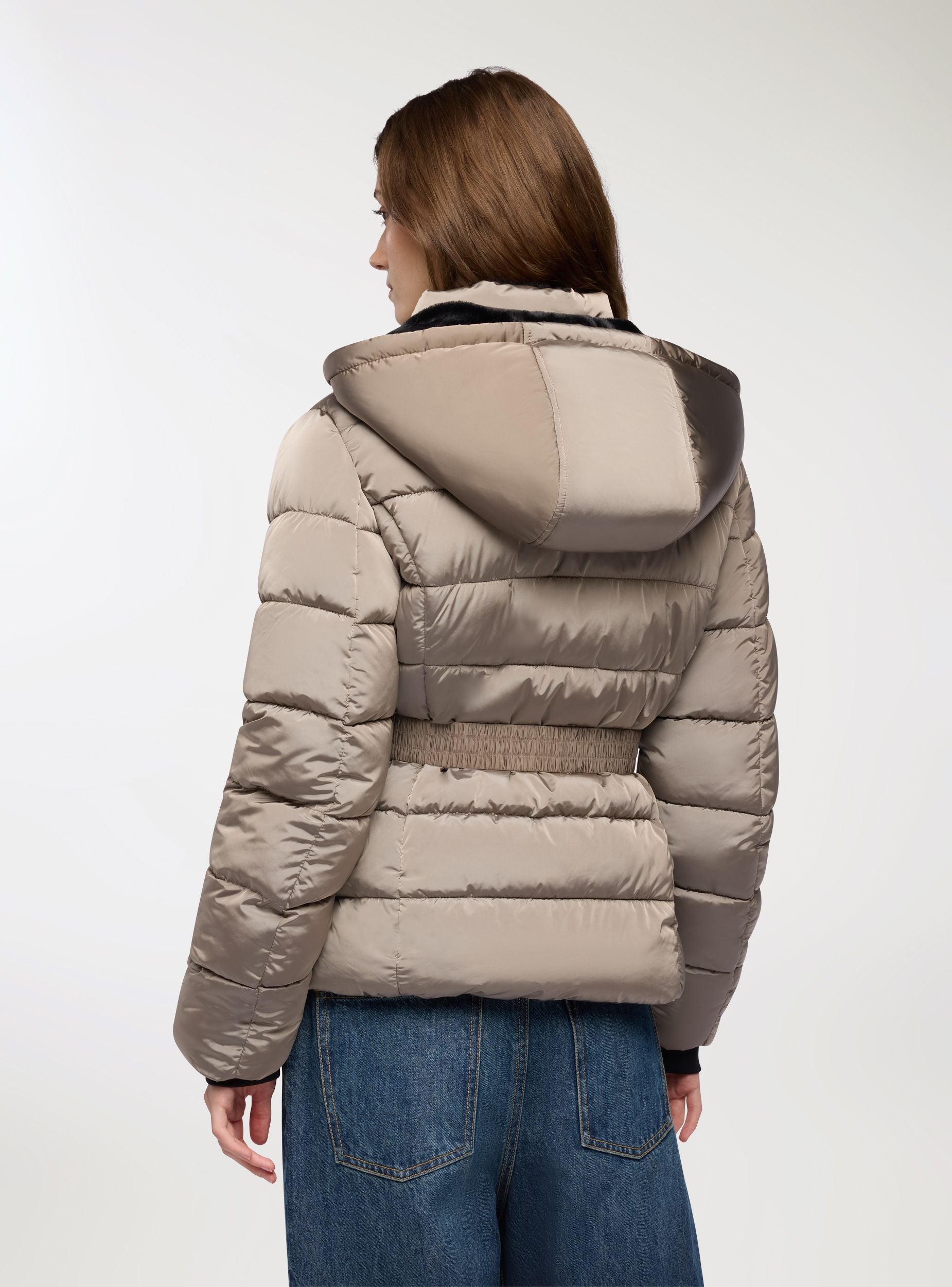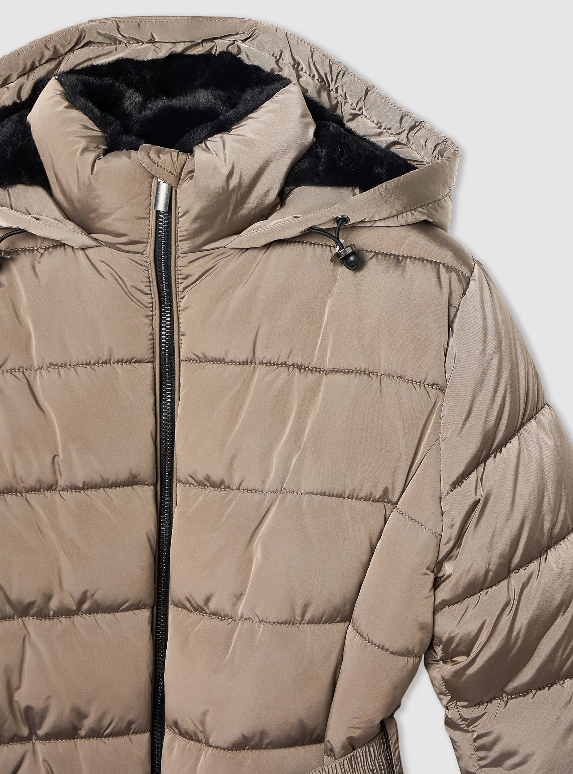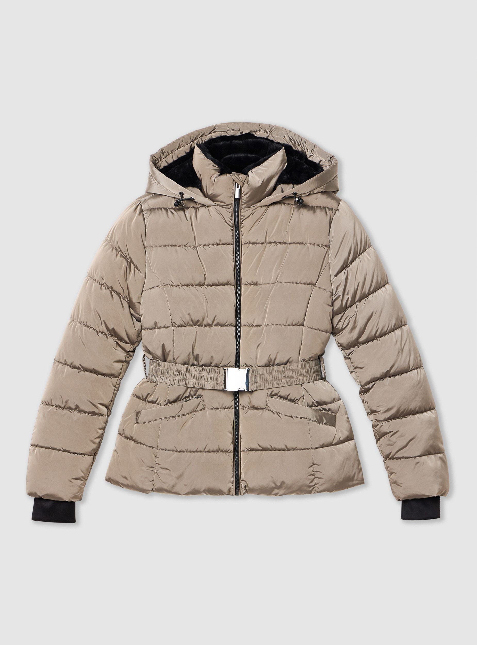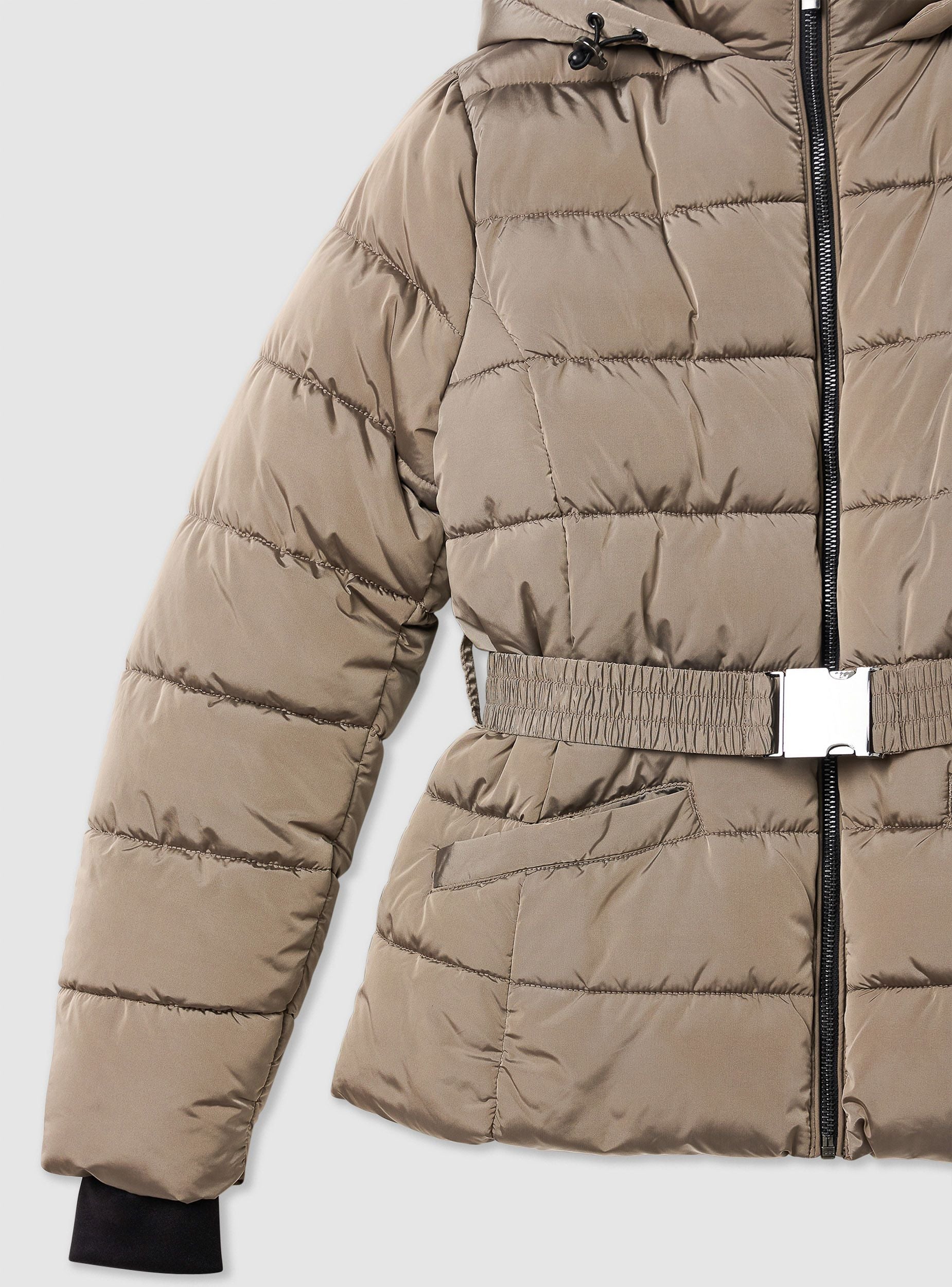 Xhaketë e mbushur për gra me kapuç, ideale për ditët e ftohta. Ka një mbyllje me zinxhir dhe një rrip të rregullueshëm në bel për një përshtatje të personalizuar. Dizajni me ngjyrë të vetme e bën atë të shumëanshëm dhe të përshtatshëm për shumë raste. Perfekte për të kompletuar veshjet casual dhe sportive, duke garantuar rehati dhe stil.Detajet