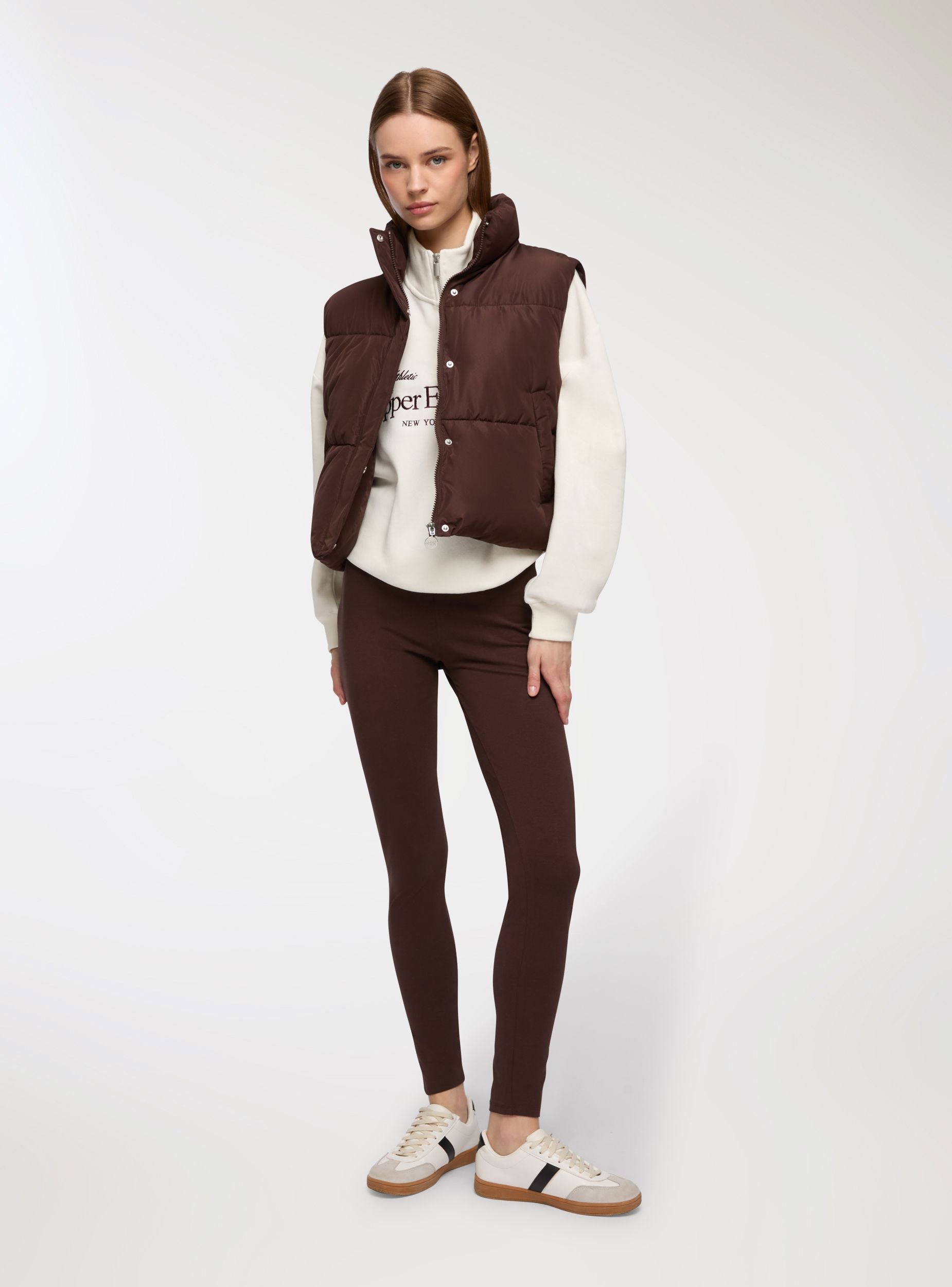 Jaketë për gra me qafë të lartë dhe mbyllje frontale me zinxhir të fshehur dhe butona me shtypje, ideale për të kompletuar veshjet casual dhe sportive. E pajisur me xhepa anësorë praktikë me buton me shtypje, ofron rehati dhe shumëllojshmëri. E përsosur për t’u veshur mbi bluzat ose trikotë, garanton një përshtatje të rregullt të përshtatshme për raste të ndryshme, nga koha e lirë deri te shëtitjet në natyrë.Detajet