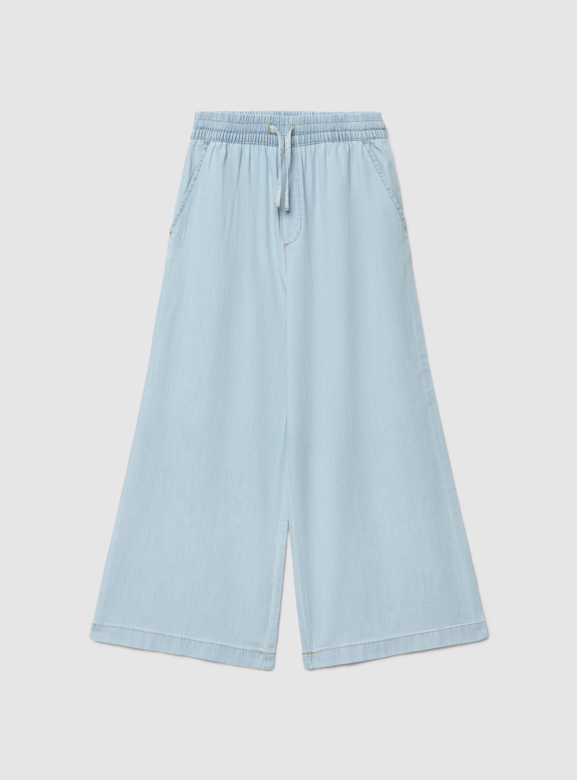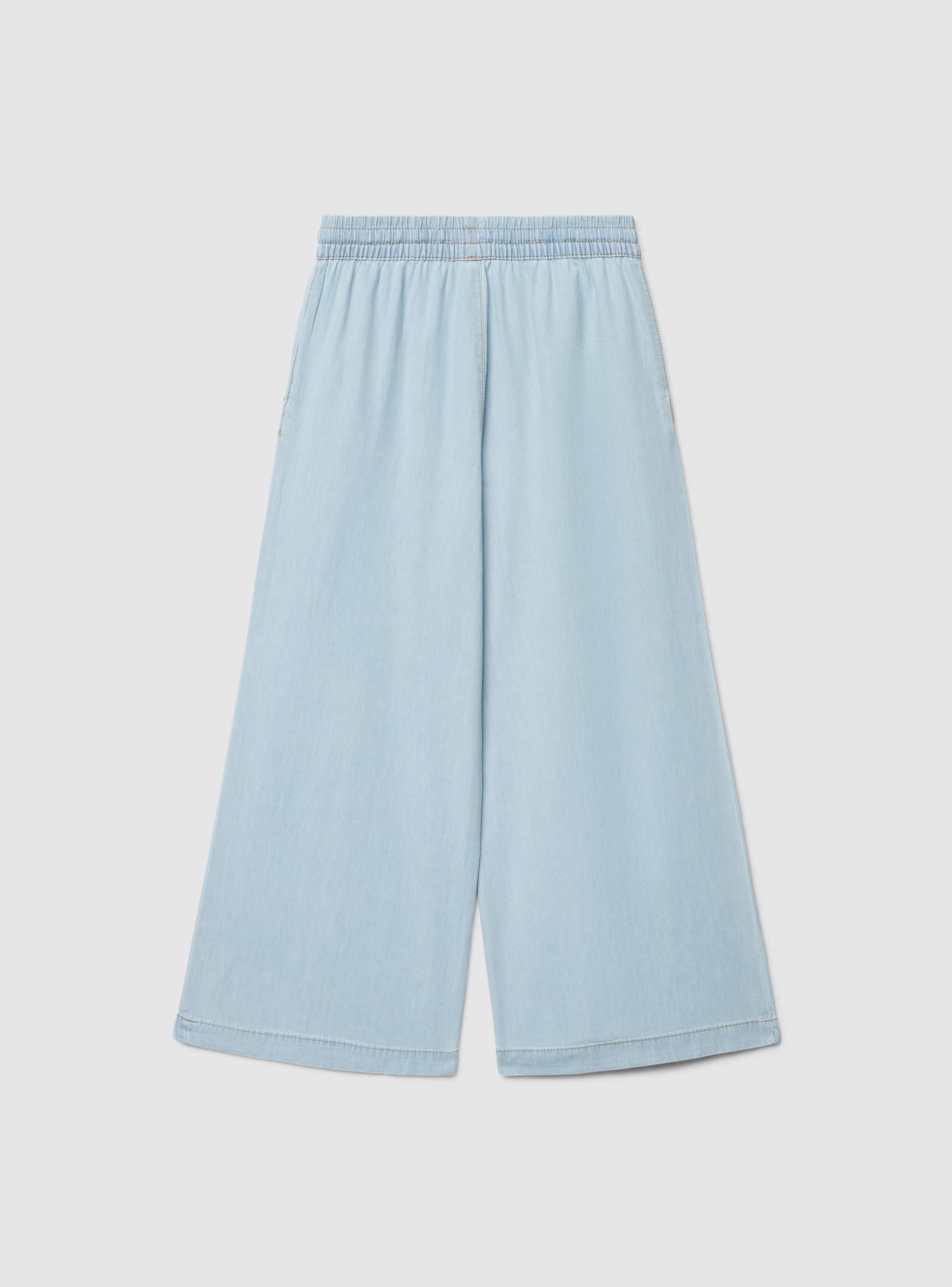 Jeans për vajza me ngjyrë të njëtrajtshme dhe prerje wide leg, të menduara për pamje ditore dhe kohë të lirë. Bel elastik me kordon siguron rehati dhe përshtatje të rregullueshme. Model i gjatë me xhepa anësorë dhe përfundime të qepura, ideal me bluzë dhe atlete ose me këmishë të lehtë për një veshje më të përkujdesur.Detajet