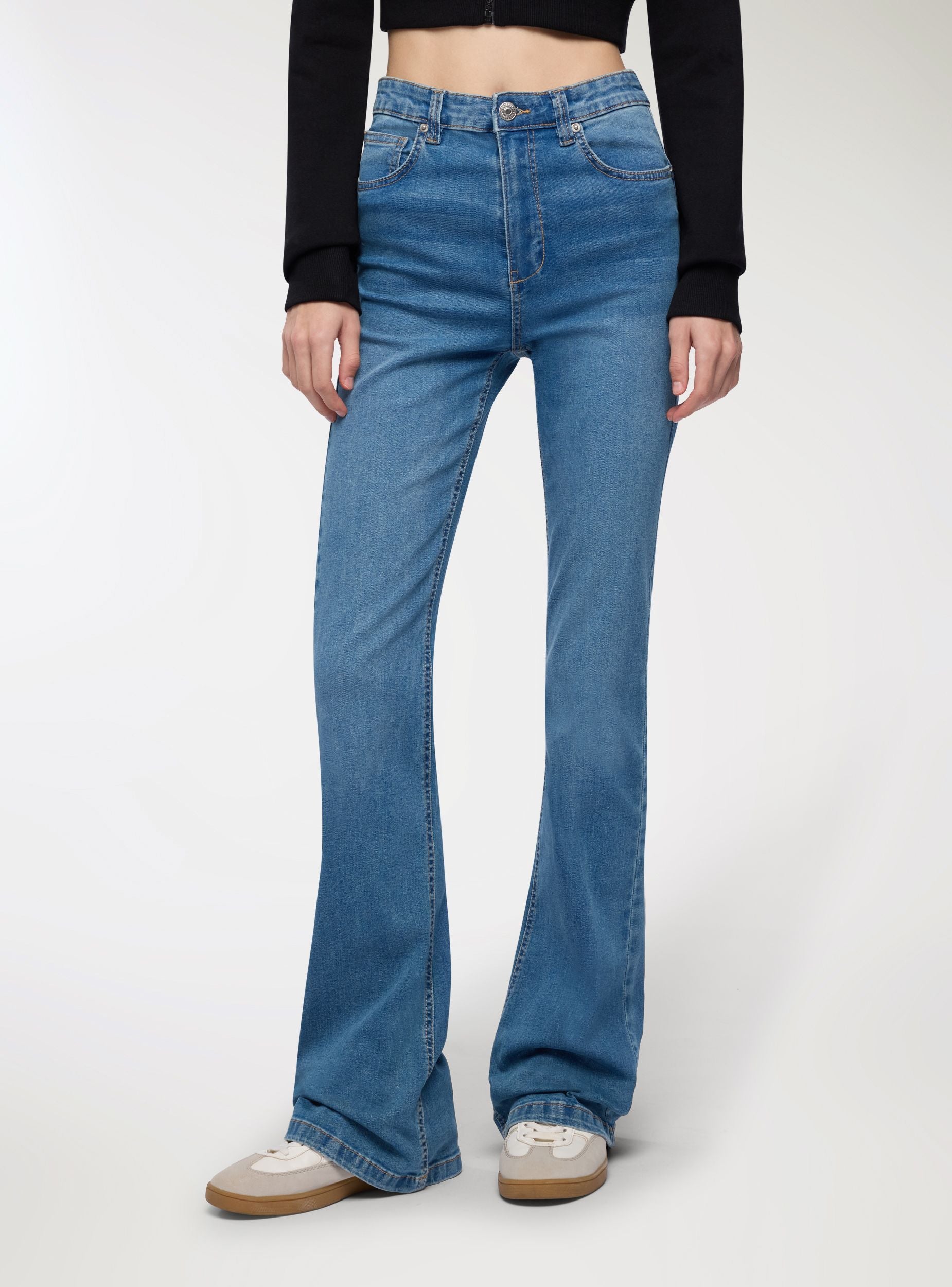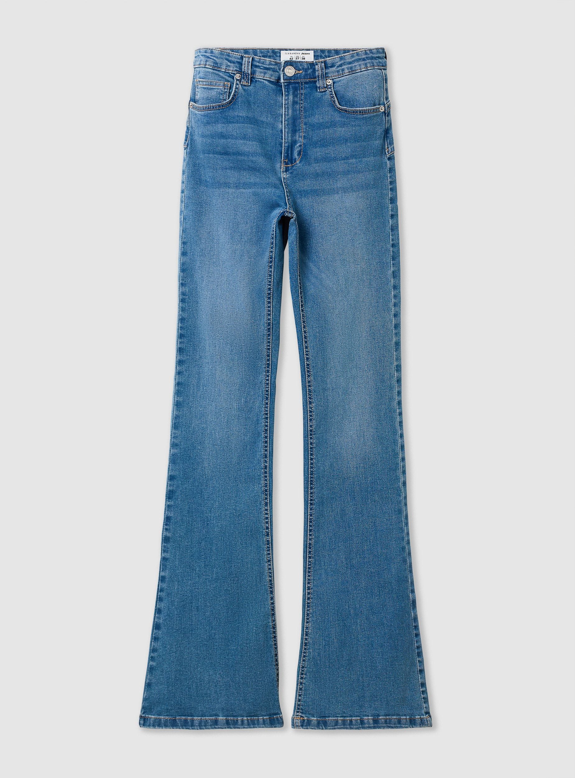 Jeans për gra me dizajn modern dhe të shumëanshëm, ideal për një pamje casual dhe në modë. Kanë një prerje me këmbë të zgjeruar që thekson siluetën, me bel të lartë për rehati optimale. E pajisur me mbyllje me buton dhe zinxhir, dhe xhepa funksionalë si në pjesën e përparme ashtu edhe në të pasme. Perfekt për t’u kombinuar me bluzat të ngushta ose këmisha të buta për një veshje të plotë dhe trendi.Detajet