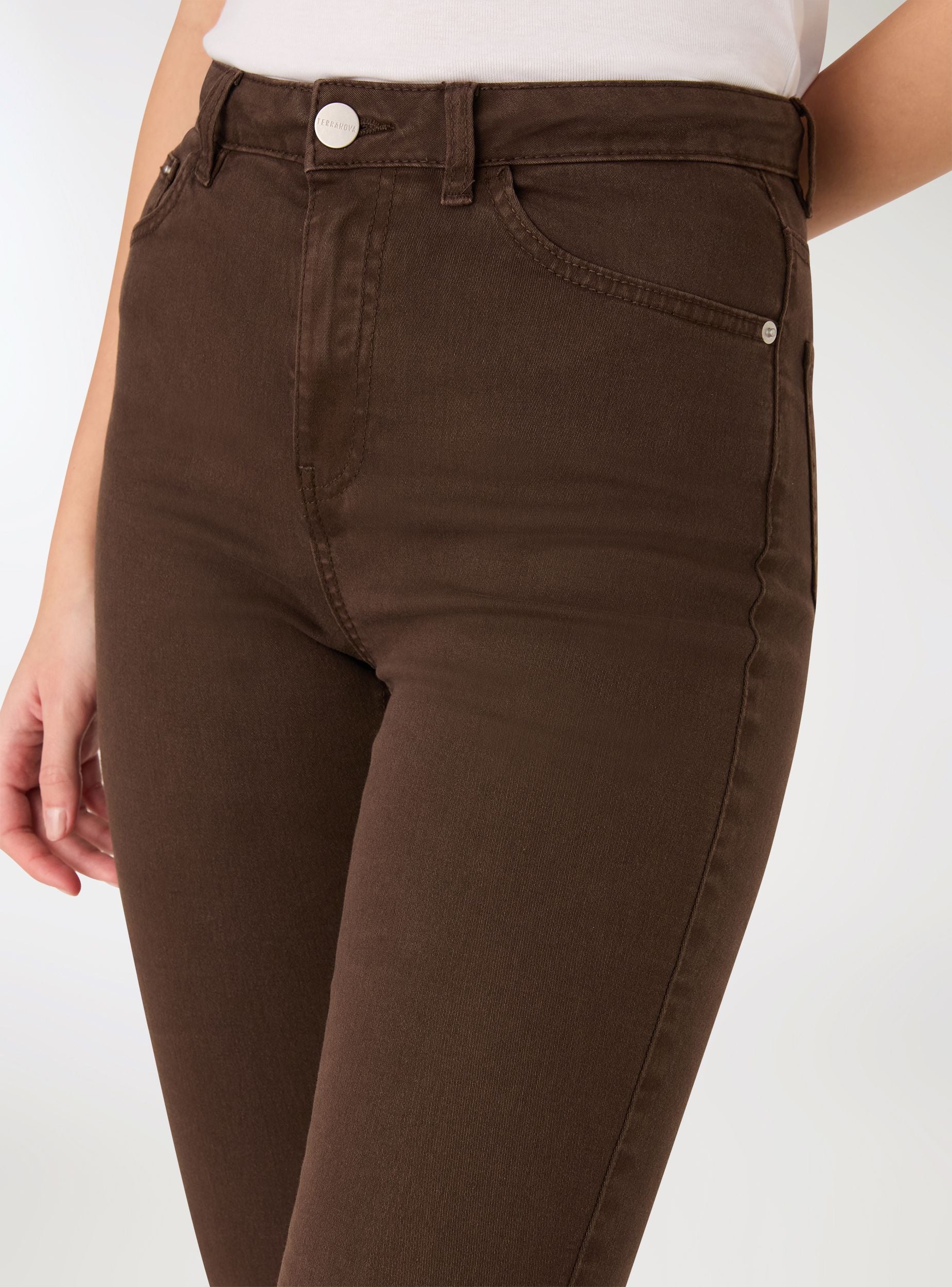 Xhinse femrash me ngjyrë të vetme, me linjë të zgjatur në fund dhe bel të lartë, ideale për të zgjatur figurën. Mbyllje me buton dhe zinxhir, rripa për brez dhe 5 xhepa për funksionalitet. Perfekte me çizme të shkurtra ose atlete dhe një pulovër të butë. Përshtatje e rregullt me hapje të zgjeruar në fund.Detajet