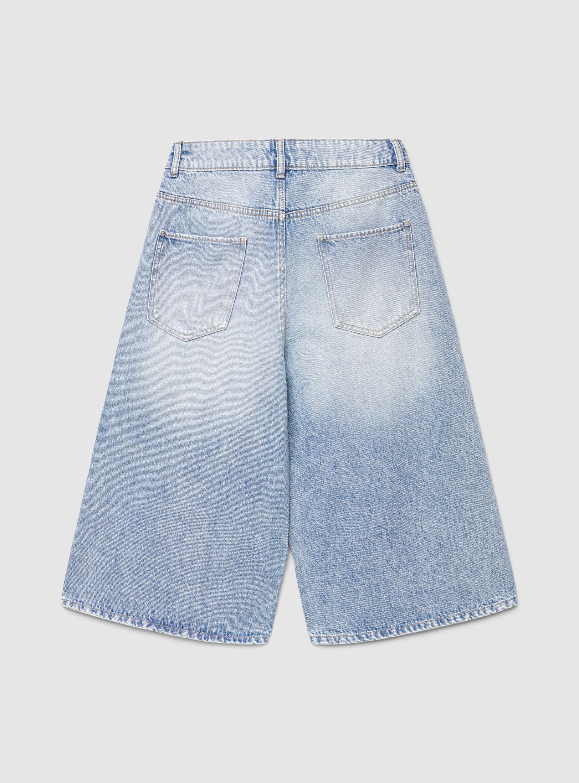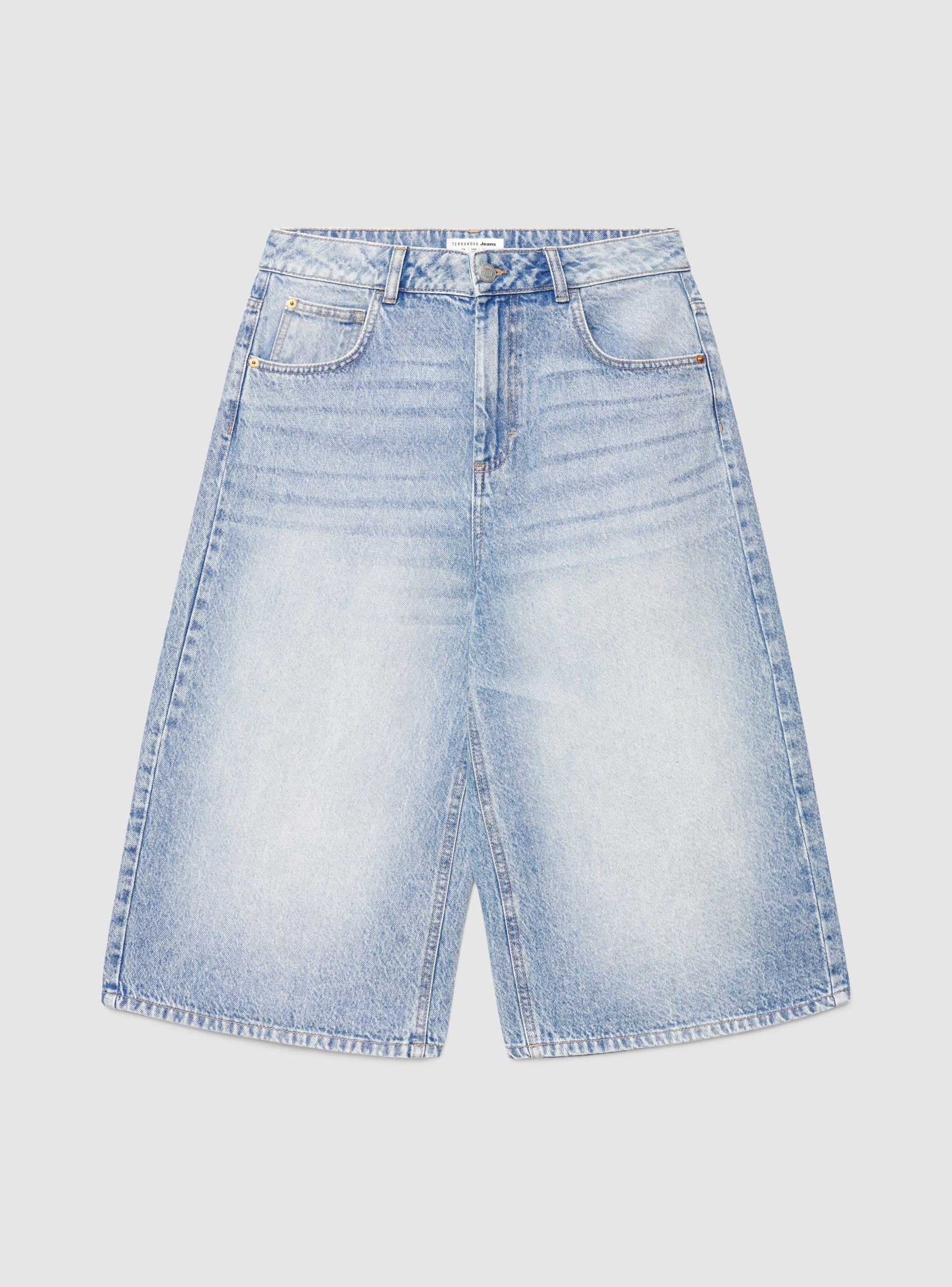 Pantalona xhins për gra me prerje të gjerë dhe gjatësi deri në gju, ideale për stil casual dhe street. Model me ngjyrë të njëtrajtshme me rripa në bel, mbyllje me buton dhe zinxhir, dhe ndërtim me pesë xhepa, me rivete dhe qepje të dukshme. Mund të kombinohen me t-shirt dhe atlete ose me top dhe sandale për kohën e lirë në qytet.Detajet