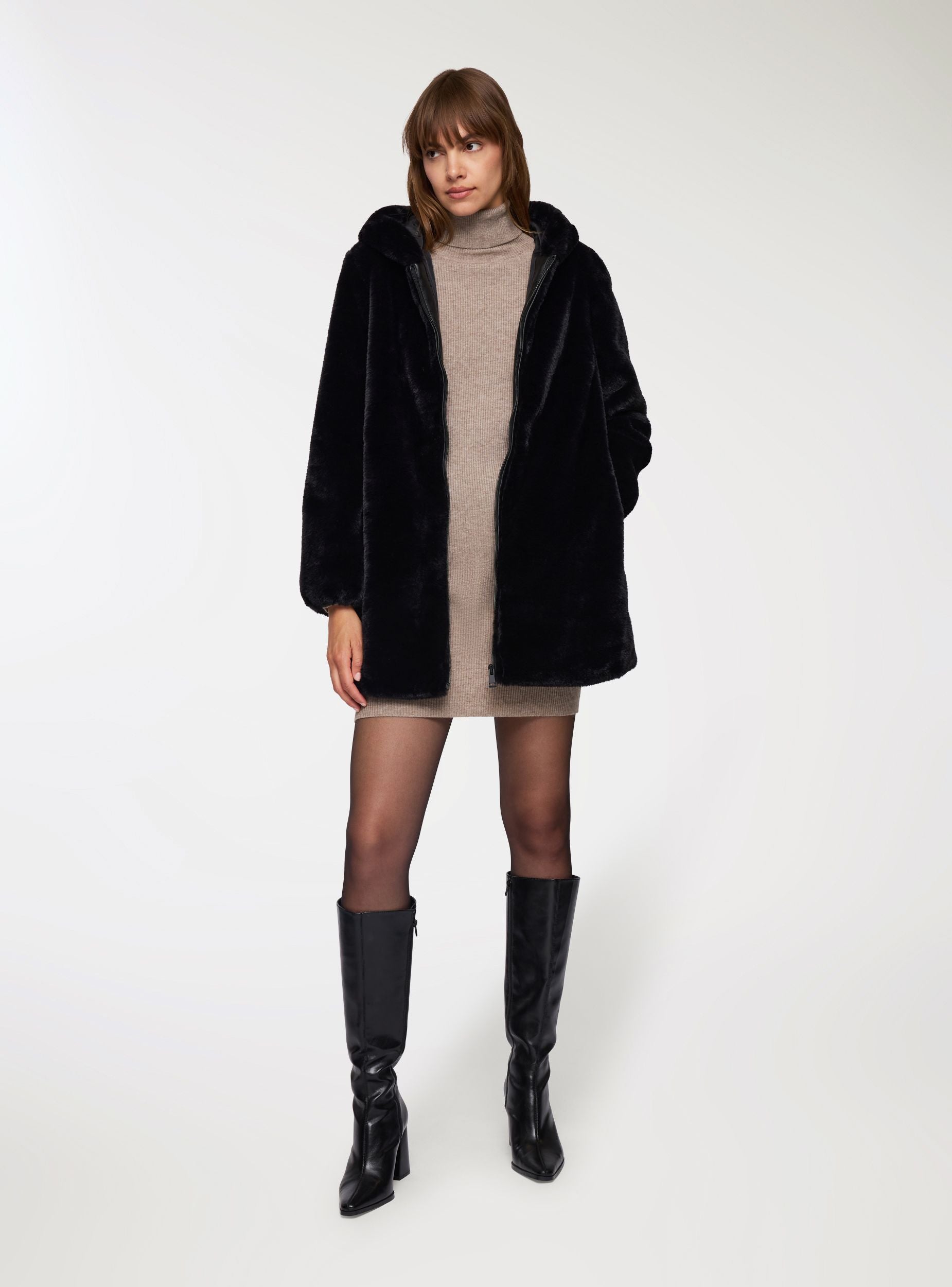 Kapitelli për gra me kapuç, me një linjë të drejtpërdrejtë dhe përfshirëse, perfekt për të përballuar ditët më të ftohta me një prekje glamuroze. Gjatësia mesatare e bën të përshtatshëm për t'u veshur mbi pantallona skinny ose funde ngjitur për një pamje metropolitane. Zip-i frontal garanton një mbyllje praktike, ndërsa dizajni thelbësor dhe përfundimi me pelush sintetik i japin stil edhe daljeve më informale. Elementet përfundimtare janë xhepat anësorë, të rehatshëm dhe funksionalë.Detajet