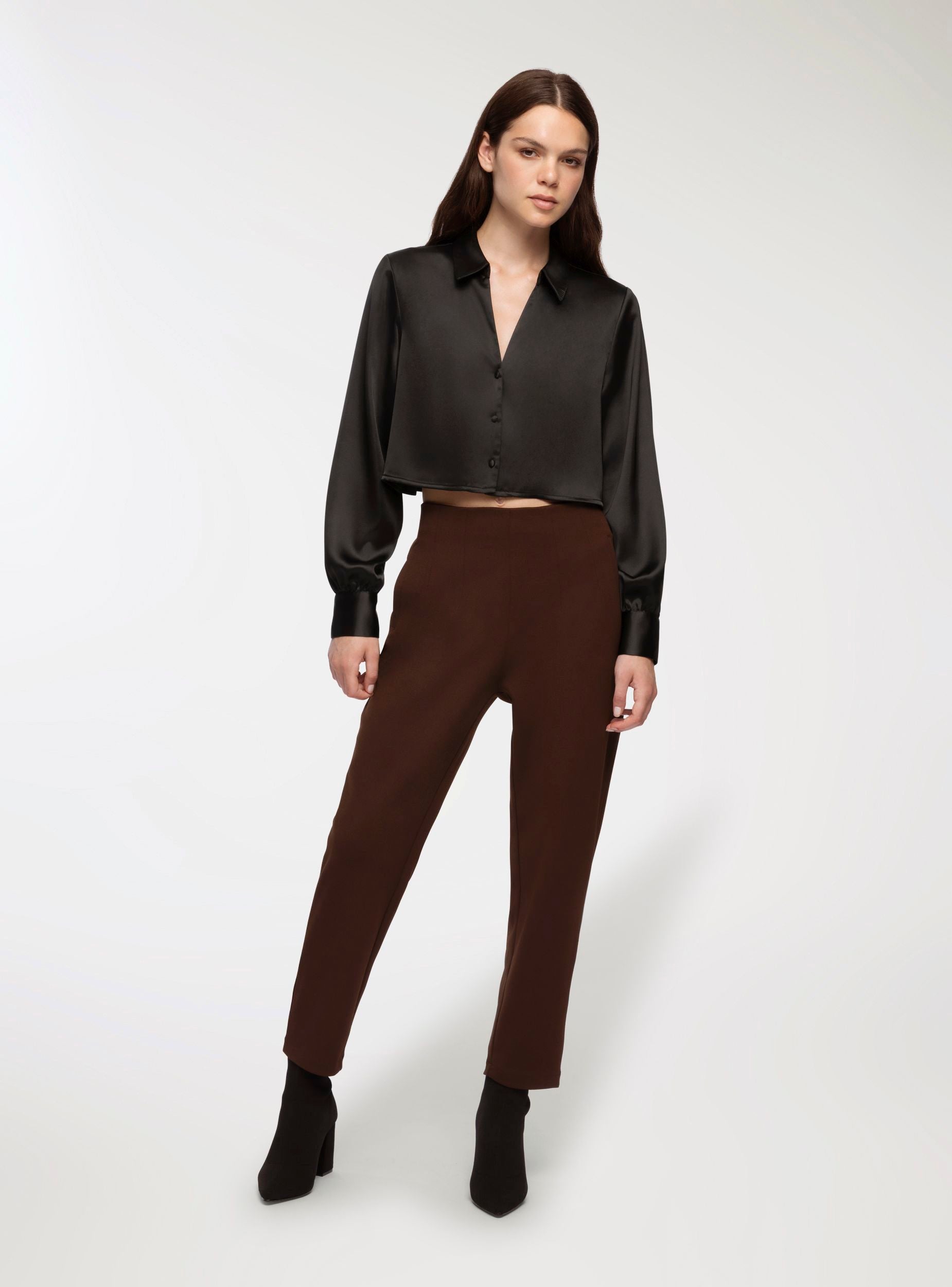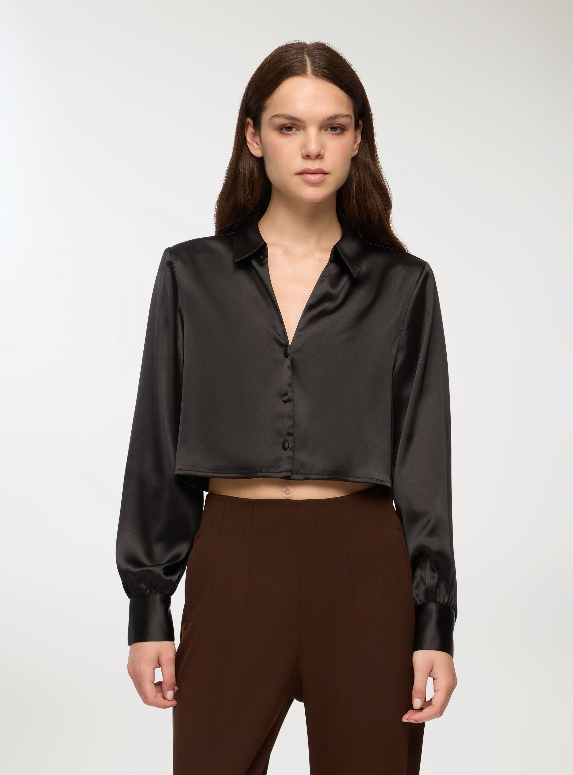 Këmisha për gra me prerje të shkurtër, e përsosur për një pamje sofistikuar dhe moderne. Mëngët e gjata me manşeta të mbyllura i japin elegancë, ndërsa materiali me efekt saten thekson shkëlqimin e veshjes. Kravatë dhe mbyllja me butona shtojnë një prekje rafinuar, duke e bërë atë ideale për veshje si të rastësishme ashtu edhe më të rafinuara. Një veshje shumë funksionale, e përsosur për ata që duan të dallohet me stil.Detajet