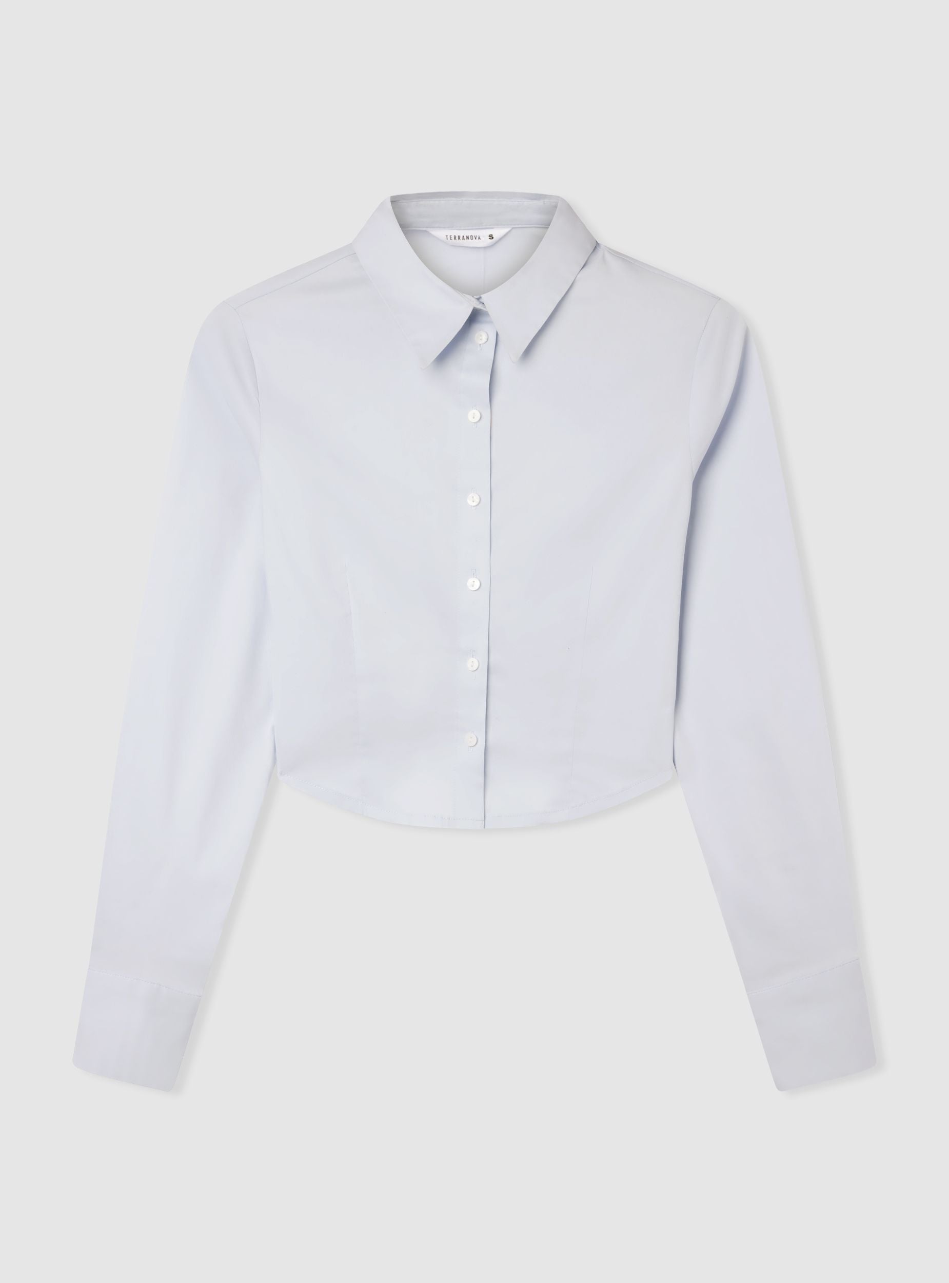 Këmisha për gra e shkurtër me ngjyrë të njëtrajtshme, ideale për pamje urbane dhe bashkëkohore. Modeli ka jakë klasike, mëngë të gjata dhe mbyllje përpara me düshka. Pjesa e pasme karakterizohet nga një insert në pikë smock që i jep një prekje moderne dhe përmirëson përshtatshmërinë. Perfekte për t'u kombinuar me pantallona me brez të lartë ose funda për veshje të ndryshme, e përshtatshme si për zyrë ashtu edhe për kohën e lirë.Detajet