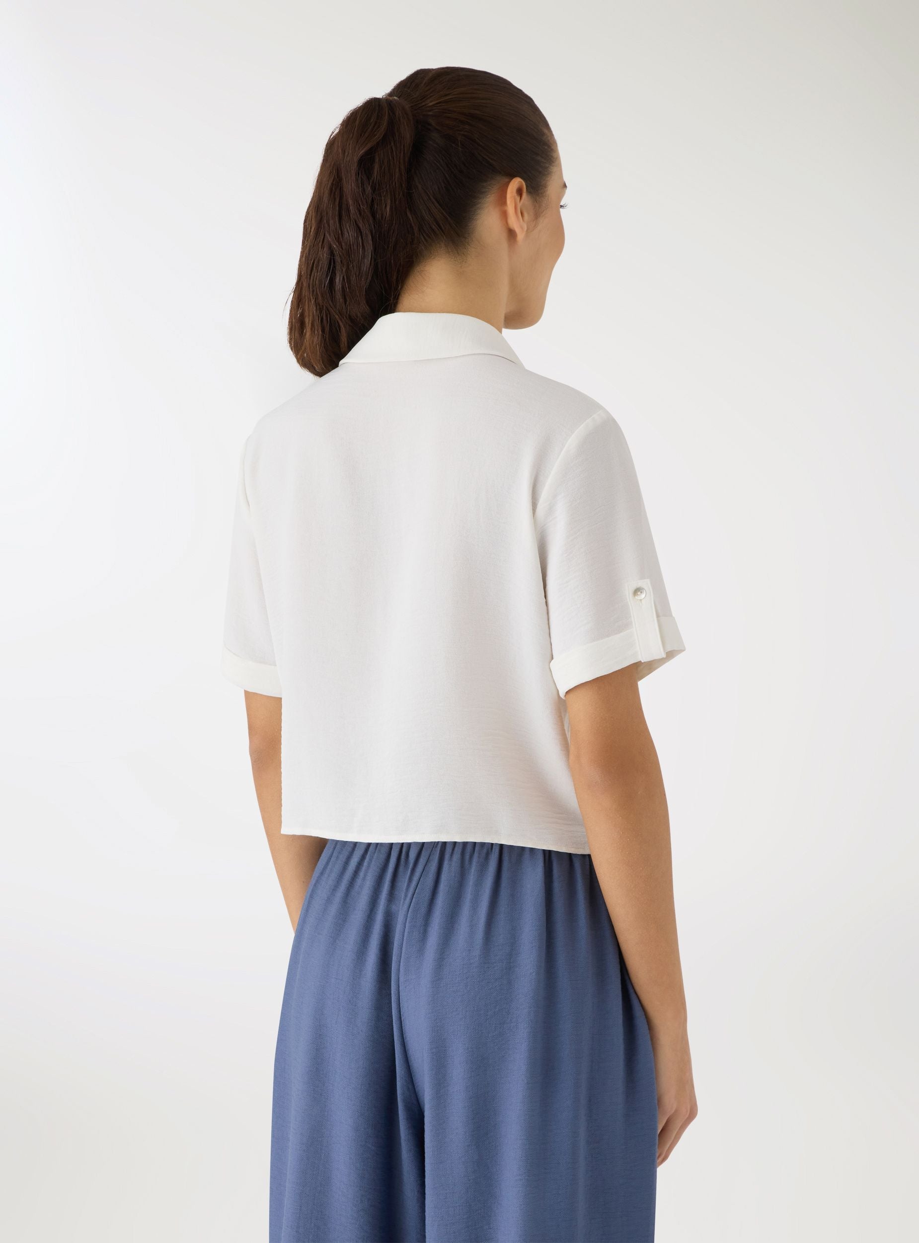 Këmishë për gra me mëngë të shkurtra në ngjyrë të vetme, me prerje të shkurtuar dhe nyje në pjesën e përparme. Jakë me majë, mbyllje me butona dhe dy xhepa të aplikuar në gjoks. Mëngët kanë përkulje të fiksuar me rrip dhe buton. E përsosur për një pamje casual ose trendy, kombinohet me xhinse me bel të lartë, funde dhe pantallona të shkurtra për të krijuar veshje të freskëta dhe të shumëanshme në ditët e lirë ose në qytet.Detajet