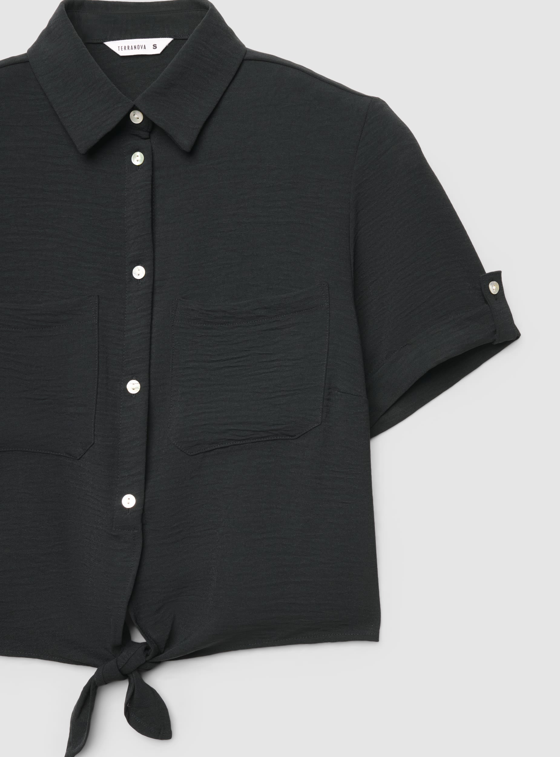 Këmishë femrash me mëngë të shkurtra në ngjyrë të njëtrajtshme me prerje crop dhe nyje në pjesën e përparme. Jakë me majë, mbyllje me butona dhe dy xhepa të aplikuar në gjoks. Mëngët me përkulje të fikseuar me shirit dhe buton. E përsosur për një pamje casual ose trendy, kombinohet me xhinse me bel të lartë, funde dhe pantallona të shkurtra për të krijuar veshje të freskëta dhe të shumëanshme në ditët e lira ose në qytet.Detajet