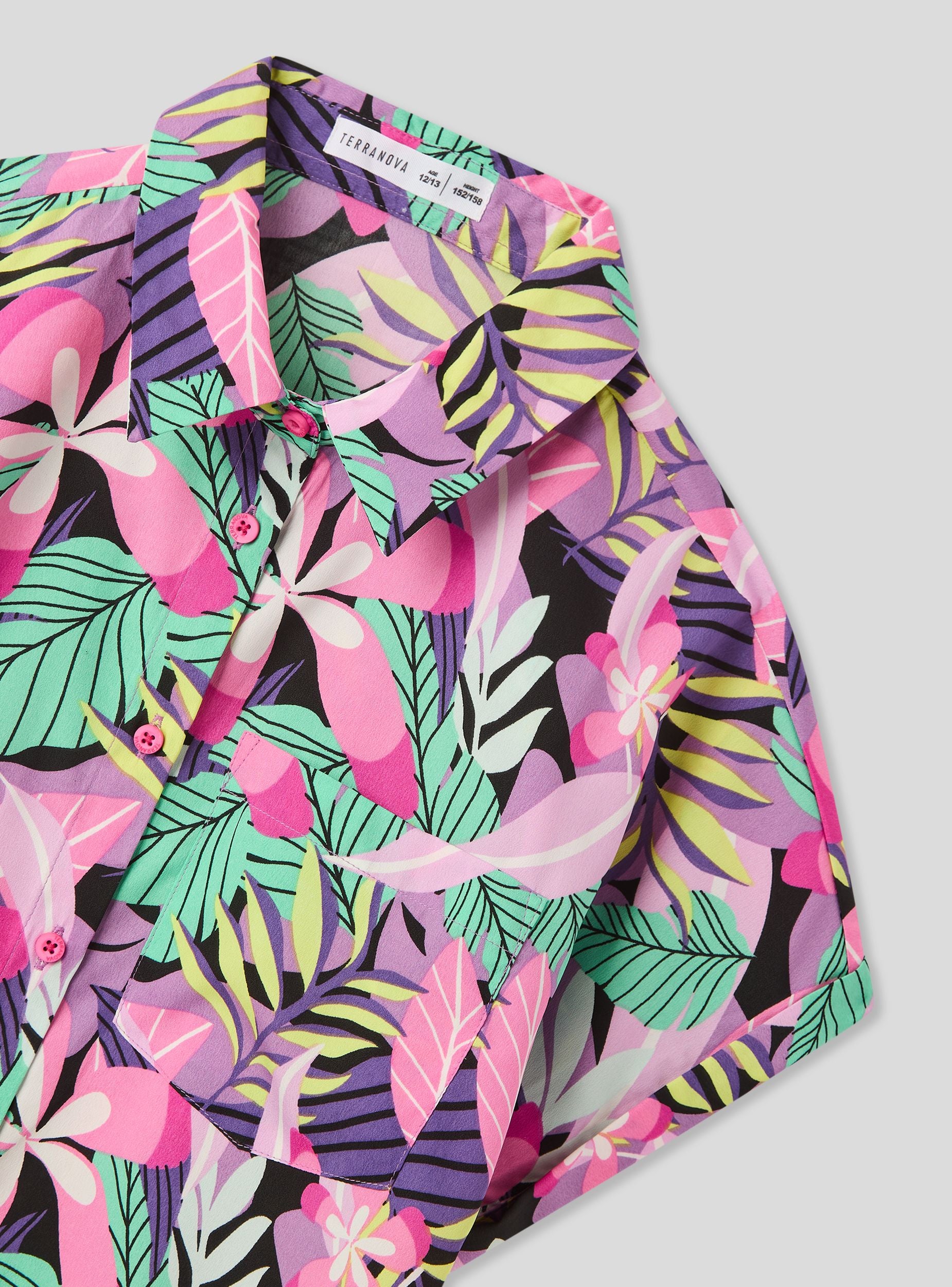 Këmisha për vajza e karakterizuar nga një fantazi të mrekullueshme resort që rikthen atmosferat tropikale. Një nyjë në pjesën e përparme i shton një prekje lojëra dhe trendy, ndërsa butonat dhe kravatë i japin një pamje të kuruar. Mëngët e shkurtra sigurojnë freski, dhe xhepi praktik kompleton dizajnin me funksionalitet. E përsosur për të sjellë gëzim dhe stil në ditët verore.Detajet