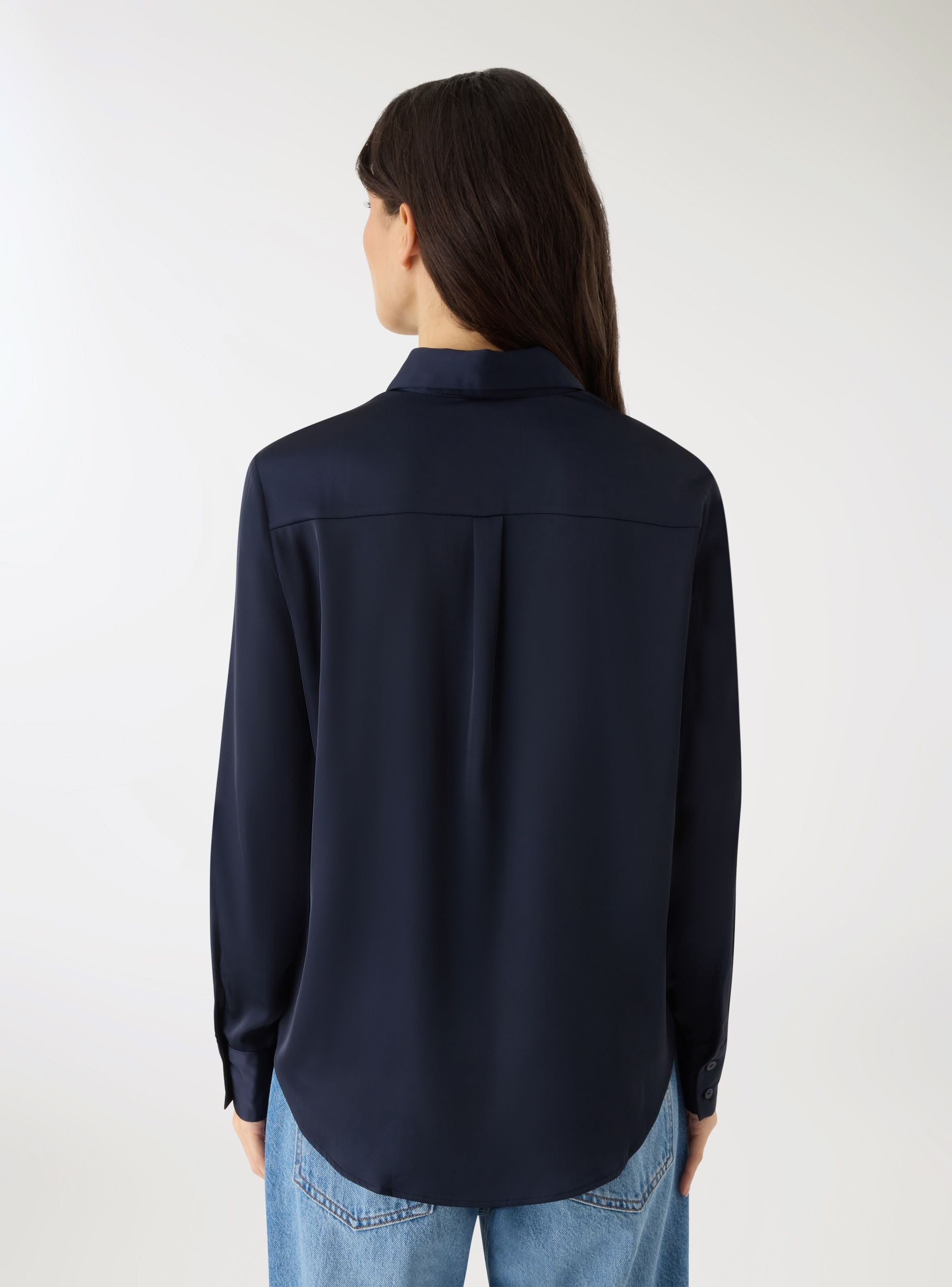 Këmishë për gra nga materiali i ngjashëm me satin në ngjyrë të njëtrajtshme. Krah klasik dhe mbyllje frontale me butona të mbuluar, mëngë të gjata dhe fund i rrumbullakët. Përshtatje oversize. E përsosur për zyrën me pantallona palazzo dhe mocasina, gjithashtu i përshtatet edhe një look-u casual me xhinse dhe atlete. Dizajni i pastër dhe prerja e butë e bëjnë të shumëanshme nga mëngjesi në mbrëmje.Detajet