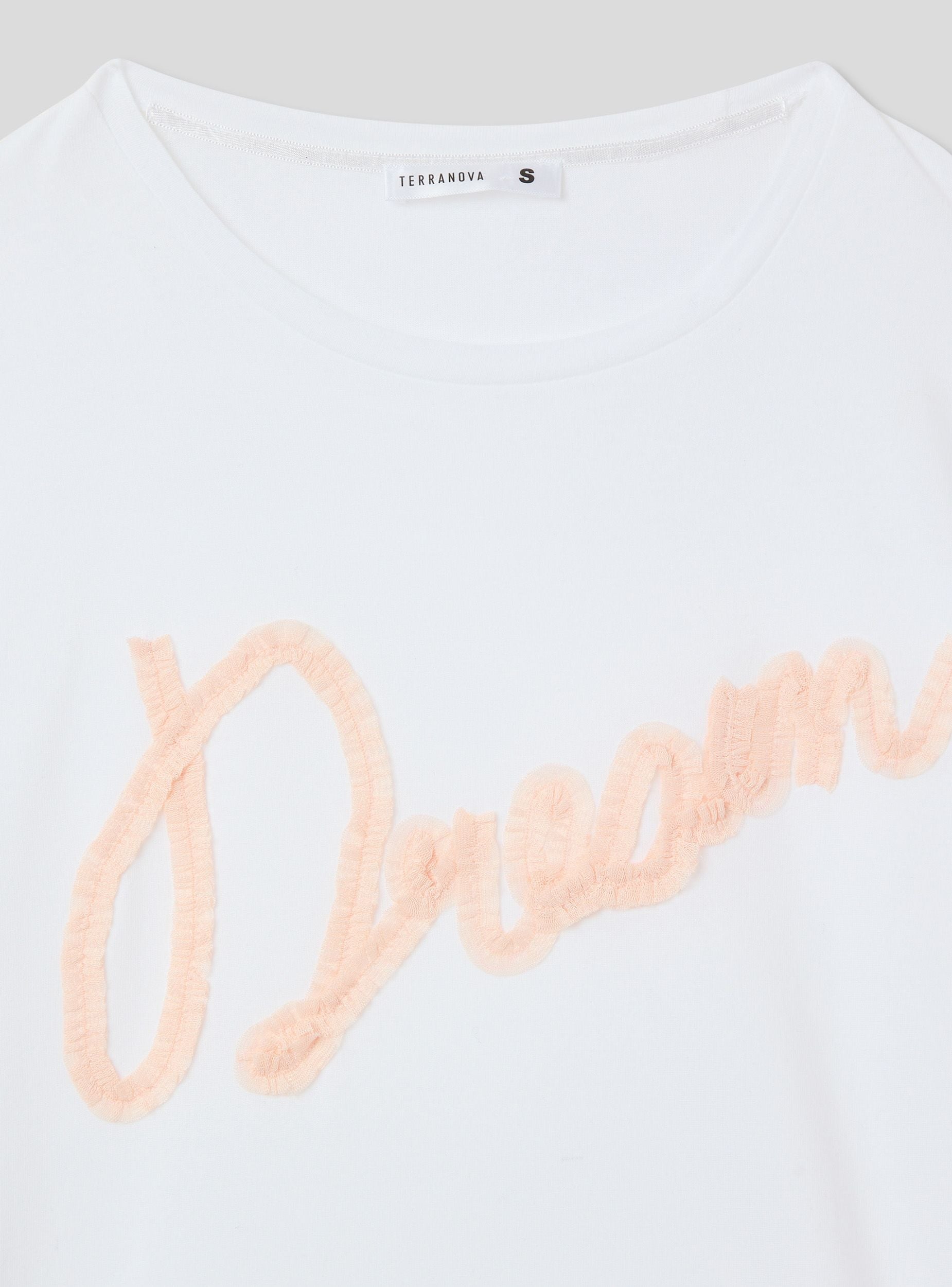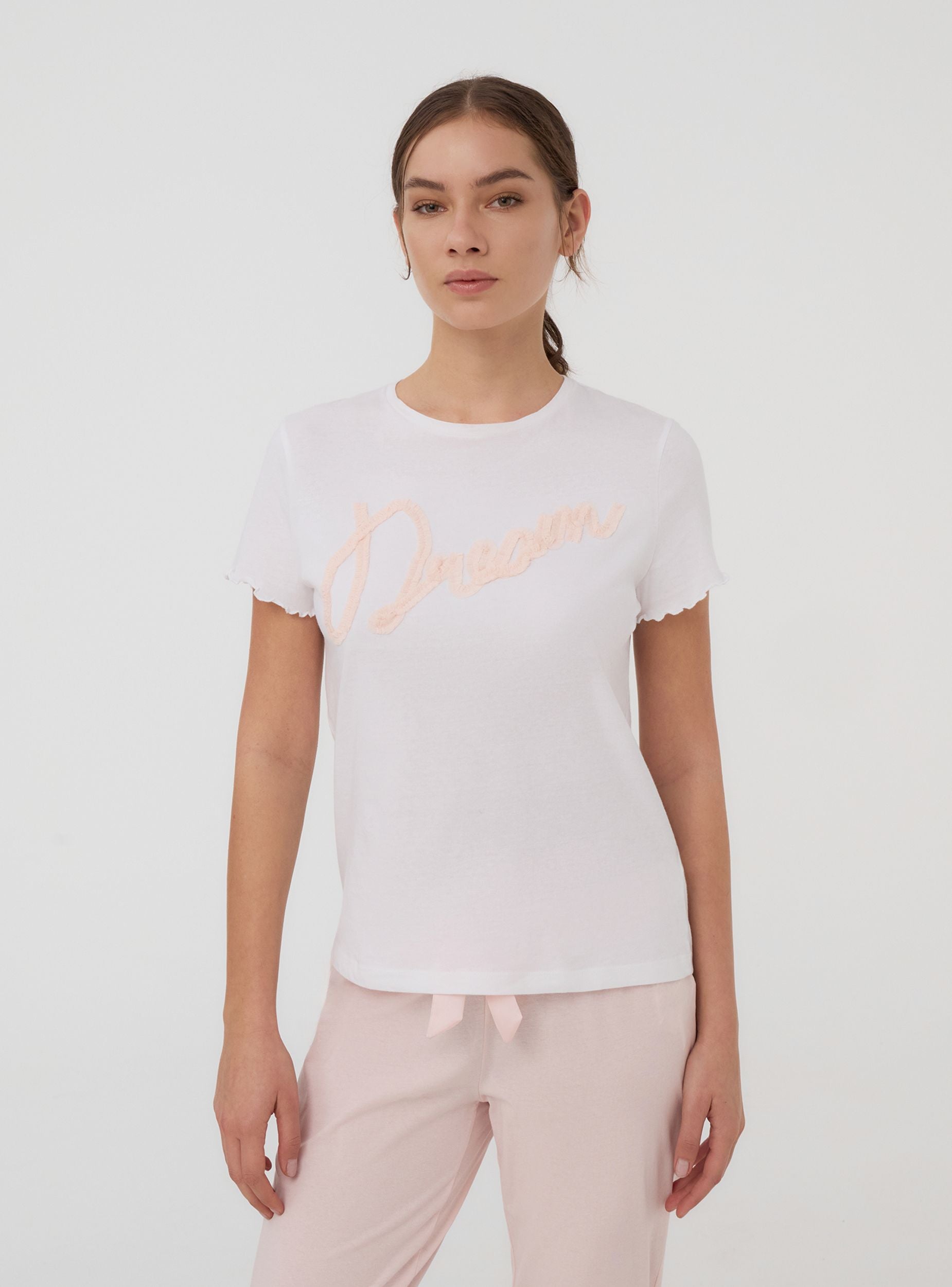 Të shkurtra pijamash për gra të përshtatshme për mbrëmjet relaksuese. Me mëngë të shkurtra dhe qafë rrethore, garanton një komoditet optimal. Shkrimi romantik në tullë shton një prekje elegante dhe femërore, ideale për ata që e duan detajin e rafinuar. Një pjesë që bashkon praktikën dhe stilin për momentet tuaja të relaksit.Detajet
