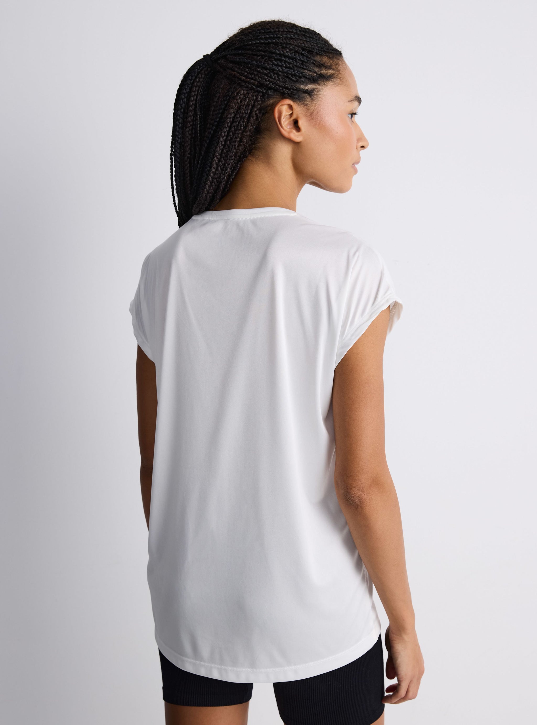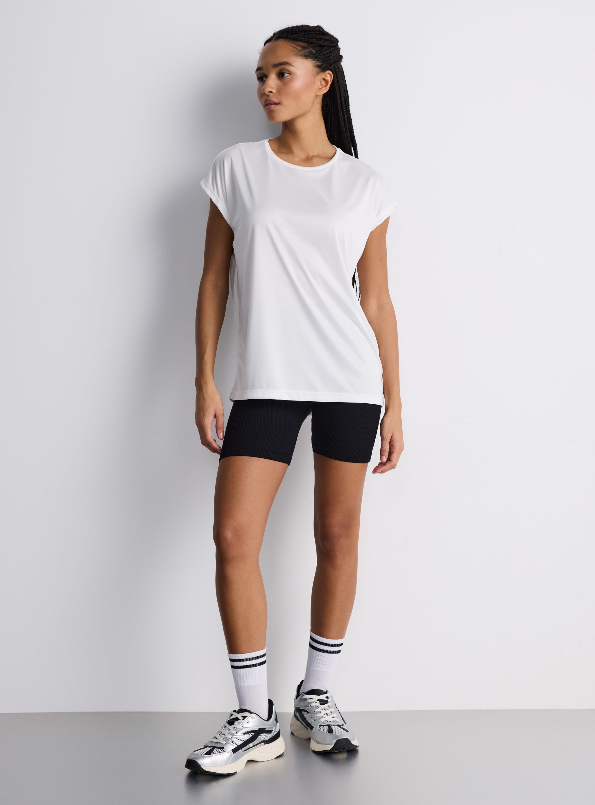 Bluzë për femra me ngjyrë të njëtrajtshme dhe përshtatje të lirshme, ideale për stërvitje dhe kohë të lirë. Me qafë rrethore dhe mëngë të shkurtra me shpatulla pak të ulura, ofron rehati dhe liri lëvizjeje. Kombinohet lehtësisht me leggingë, pantallona jogger ose shkurtra për një pamje sportive dhe të përditshme. Logo diskrete në skaj i jep një prekje dinamike. Linja Active.Detajet